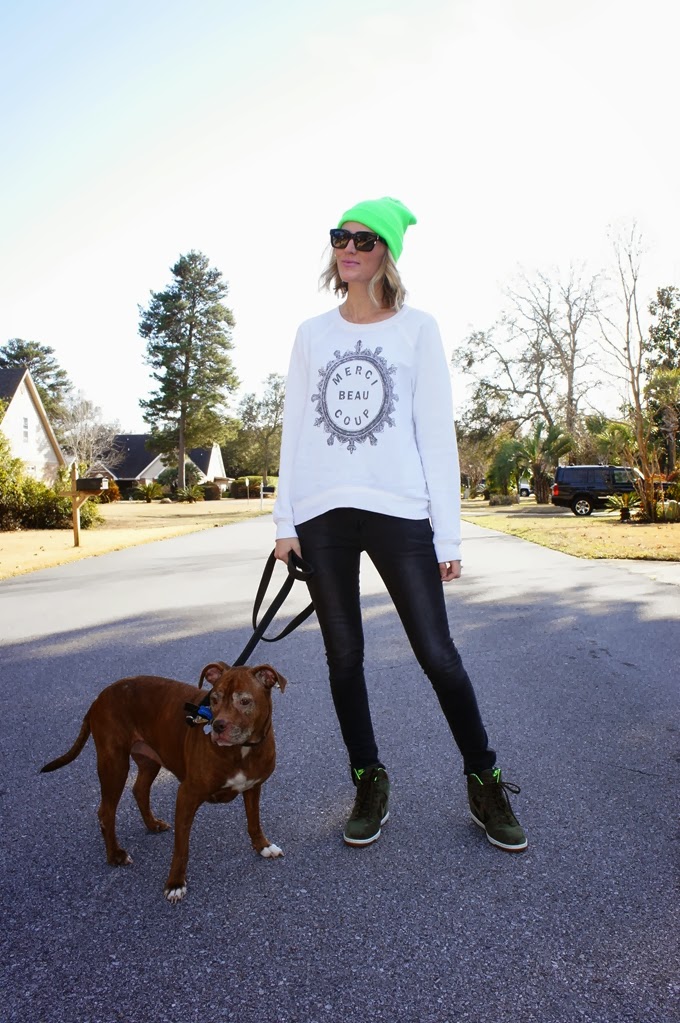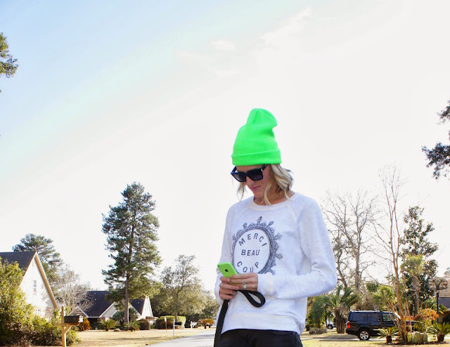 Love the pop of neon green on that beanie! You look cute and your dog is so adorable!