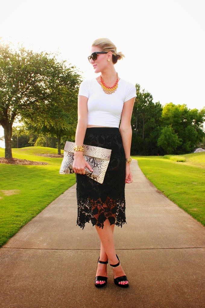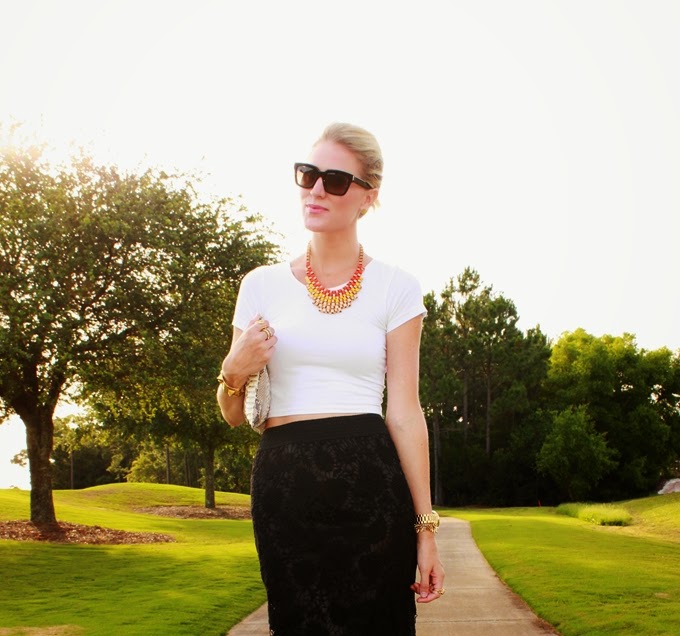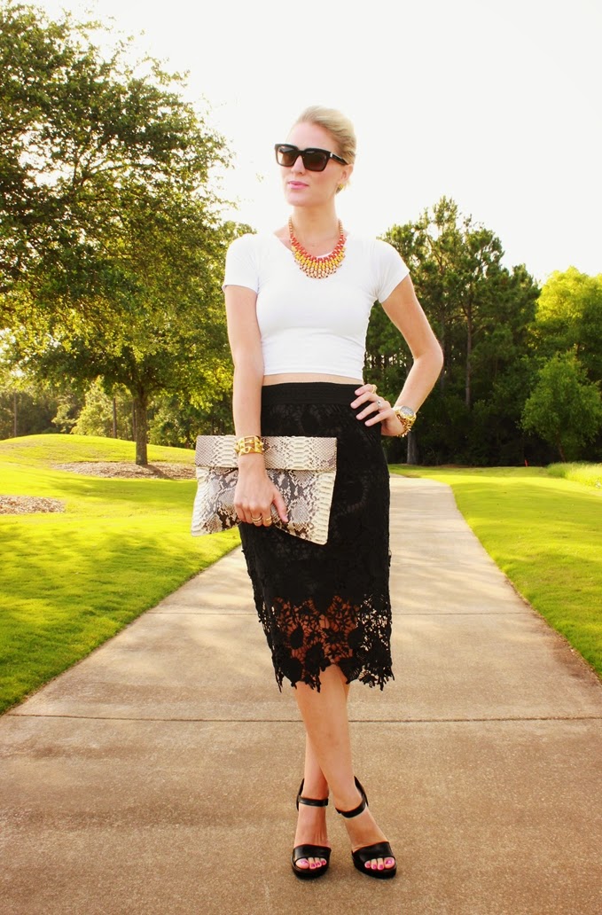 I love a classic black and white look -- it never fails. It's also the perfect minimal canvas for a stellar piece of jewelry, like this gold mystic mosaic bib necklace. This black lace pencil skirt had me at first glance and I am already looking forward to styling it a little differently on the blog. I'm thinking a more casual, effortless look is next -- like a graphic muscle tee (like this one).