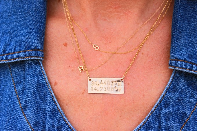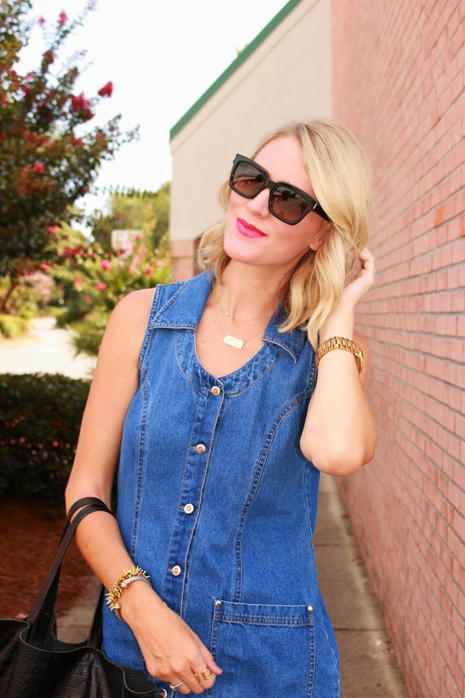 There's no denying my love for denim and when I stumble upon vintage denim, it's the best of both worlds. Case in point, this cute little denim dress I scored on a thrifting adventure over a year ago. I've worn it before, but this is the first time it's made an appearance on the blog -- I think it was about time! ;) It's definitely a comfortable option for this growing belly of mine. By the way, I'm currently 14 weeks and finally starting to feel more like myself again. The morning sickness has faded a ton, and my headaches are few and far between. Right now I'm still feeling pretty tired (especially when I first wake up) and I have some minor discomfort because of all the growing and stretching inside of me. All and all I really cannot complain. My husband and I had a dream this past Friday night that we were going to have another girl. Pretty nuts that we both had the same dream on the same night. We are going to wait to find out the sex when he/she is born, just like we did with Courtney. My friends think I'm crazy, but I think it's one of the few things in life that you can control and I think it's the best surprise! We feel it just makes this entire journey more exciting! :) P.S. You might recognize this coordinates plate necklace from a recent outfit post. It's super special to me because the coordinates are Florida State University where my hubby and I both graduated from and where we first met. I think it's the perfect companion to my Maya Brenner #8 (my lucky number) and letter "R" necklace (which I never take off)!