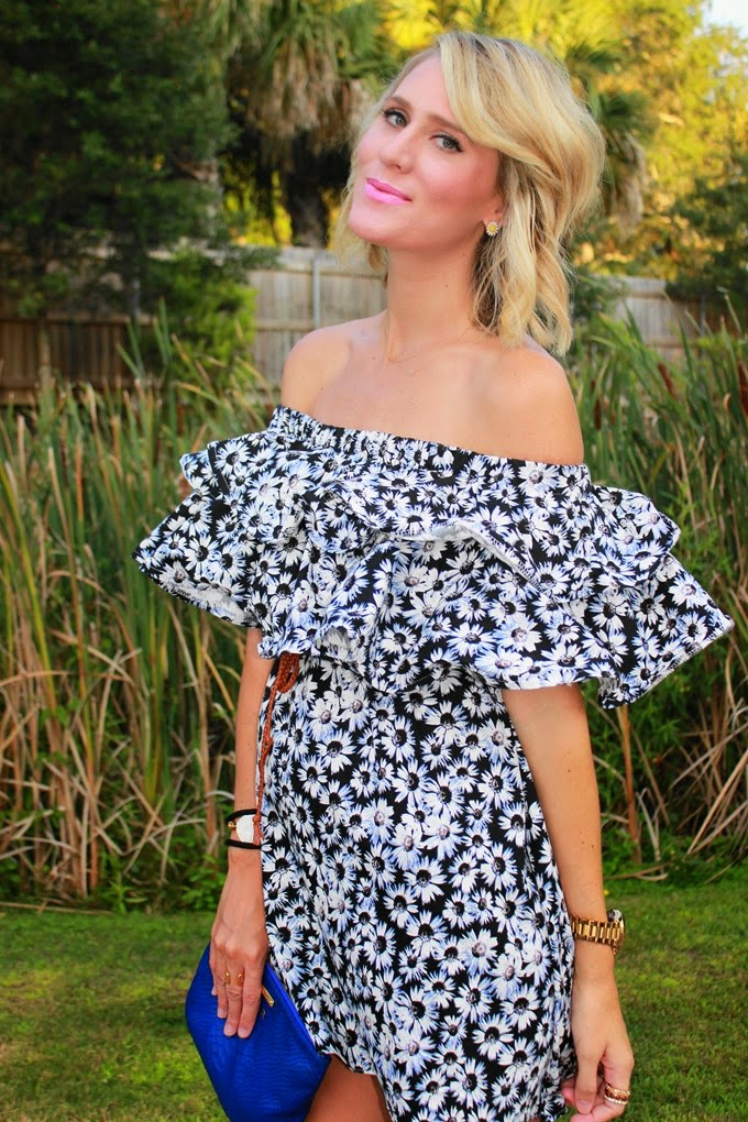 Y'all, I think I found the perfect summer dress. I mean, if I had to pick just one dress that I enjoyed wearing the most this summer it would definitely be this little number from Chic Wish (p.s. their entire site is 25% off AND you can get 30% off your first purchase!). I love the 90's inspired daisy print, the black and white color, and of course, the off-the-shoulder ruffles! Seriously these ruffles just make the dress, no?! Yes, this dress is a stand-out piece and definitely not for the shy, but it's surprisingly flattering and the fact that it fits well even w/ a baby bump means it will look good on a number of body types. The little woven belt it comes with is perfect for cinching in your waist too, so no need to worry about looking like a tent. ;)Plus, it's under $50!