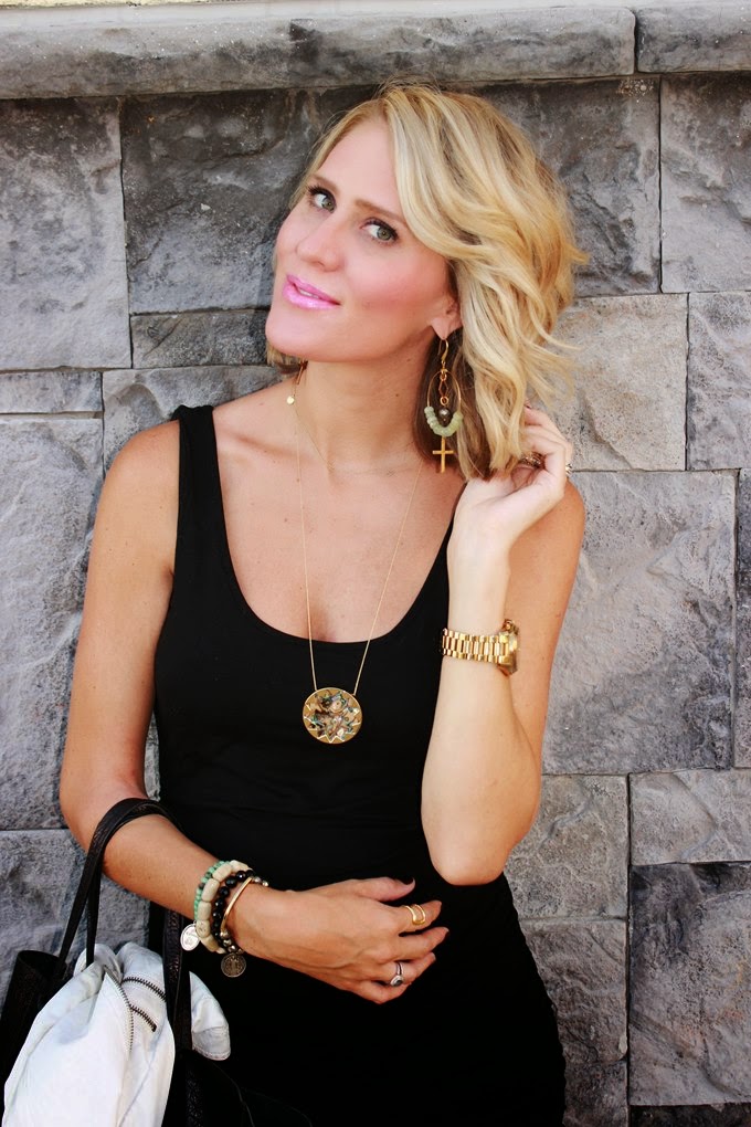 {dress: Isabella Oliver c/o // vest: Aeropostale c/o (old, similar styles HERE/HERE/HERE) // bag: Joe's Jeans // sandals: Aeropostale c/o // earrings & bracelets: Blessings In Disguise // necklace: The Jeweler's Wife c/o}