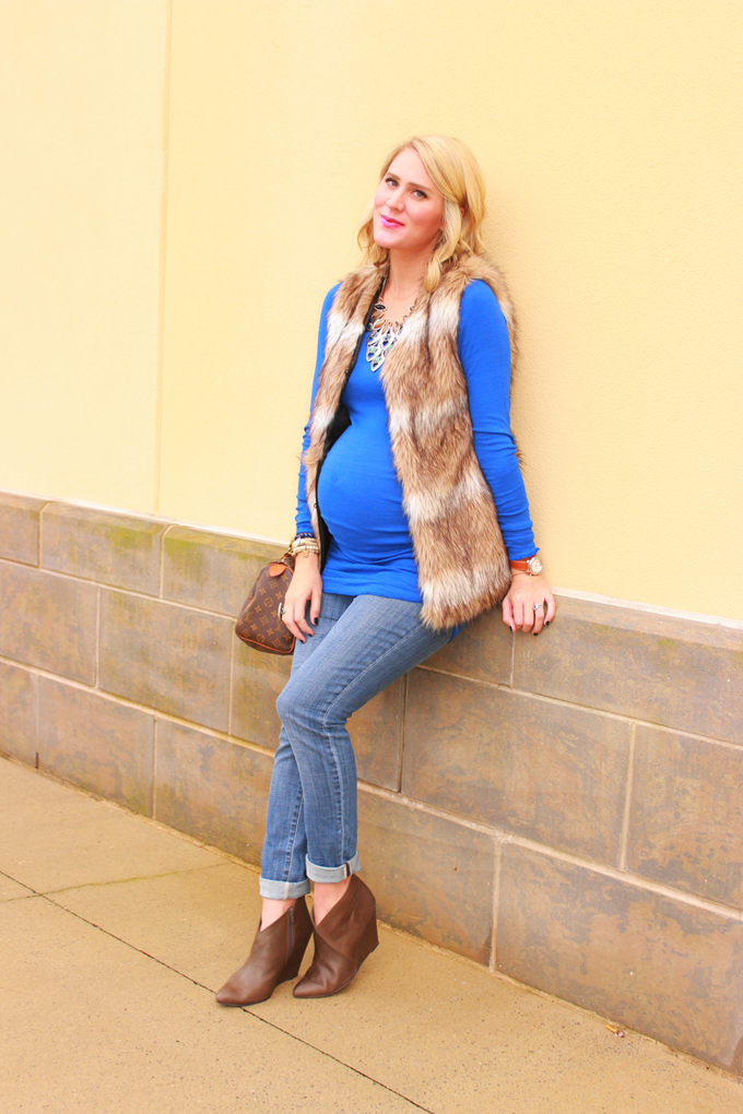 {tunic: Michael Stars (one size/2-12 pre-pregnancy) c/o Pickles & Ice Cream Maternity // denim: Destination Maternity c/o // vest: Chic Wish c/o (*on sale!) // wedge booties: Seychelles via Piperlime c/o // necklace: Prima Donna c/o // bag: vintage LV // bracelets: The Ropes Maine c/o & Blessings In Disguise // watch: Glam Rock Watches c/o}