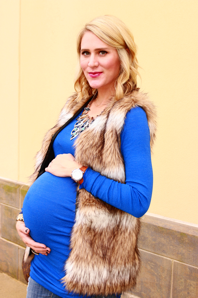 {tunic: Michael Stars (one size/2-12 pre-pregnancy) c/o Pickles & Ice Cream Maternity // denim: Destination Maternity c/o // vest: Chic Wish c/o (*on sale!) // wedge booties: Seychelles via Piperlime c/o // necklace: Prima Donna c/o // bag: vintage LV // bracelets: The Ropes Maine c/o & Blessings In Disguise // watch: Glam Rock Watches c/o}