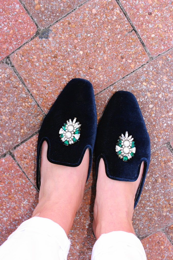 There's nothing better than a classic button-down and a great pair of denim. It's effortless chic at it's best. I decided to go for a laid-back vibe by pairing this look with these super comfy velvet slippers. You might recognize them from a recent post I did HERE. I am obsessed with the rich navy velvet and the rhinestone detailing is just too good. These slippers are so luxe and I love that you can wear them in and out of the house. They're the perfect "smoking" slipper, in my opinion. I finished off my look with a great pair of sunnies, a classic cross-body bag, and a little bling on my neck.