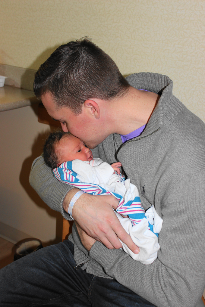 Bridgett was born on her due date -- January 9, 2015 at 5:20 PM. My doctor had me come in at 5:00 AM and she broke my water. I was only dilated about 3 cm when I arrived. Once she broke my water, they administered my epidural (around 8:00 AM) and we waited to see if my contractions would grow stronger. Unfortunately things were moving really slow, and I wasn't dilating quick enough, so they started pitocin to induce my labor. At around 3:30 PM my epidural had started to wear off, so they gave me more meds (and at a stronger dose) and I was feeling great. At 5:00 PM they checked me and I was dilated 10 cm, so we waited for the doctor to come! Waiting about 10 minutes for that doctor to come felt like an eternity. We were SO excited to meet our new baby and the suspense was killing us -- was it going to be a girl or a boy? Once the doctor arrived I only had to push a few times and Bridgett was here! Hearing her cry for the first time was the sweetest sound. When your baby is placed on your chest for the first time it is such a magical feeling. Totally indescribable. You just feel an instant love at that moment.