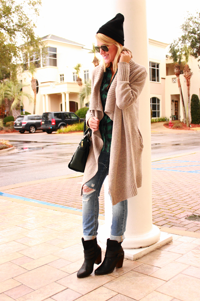 Since I’m also adjusting back into wearing clothing that isn’t sweats or pajamas, I went with some of my go-to pieces for a casual yet still put-together look to run some errands (including baby B’s first doc apt and Court’s 2 year check-up). A great pair of distressed denim, a buffalo plaid shirt, and a cozy open cardigan sweater paired perfectly with my new boots from DSW. I’m loving the straps around these boots and also that they’re more of a midi-style (hitting slightly above my ankles). Plus, the chunkier heel on these boots makes them super comfy for running errands, which is exactly what this busy mama craves. I can’t wait to style these boots in other fun ways.