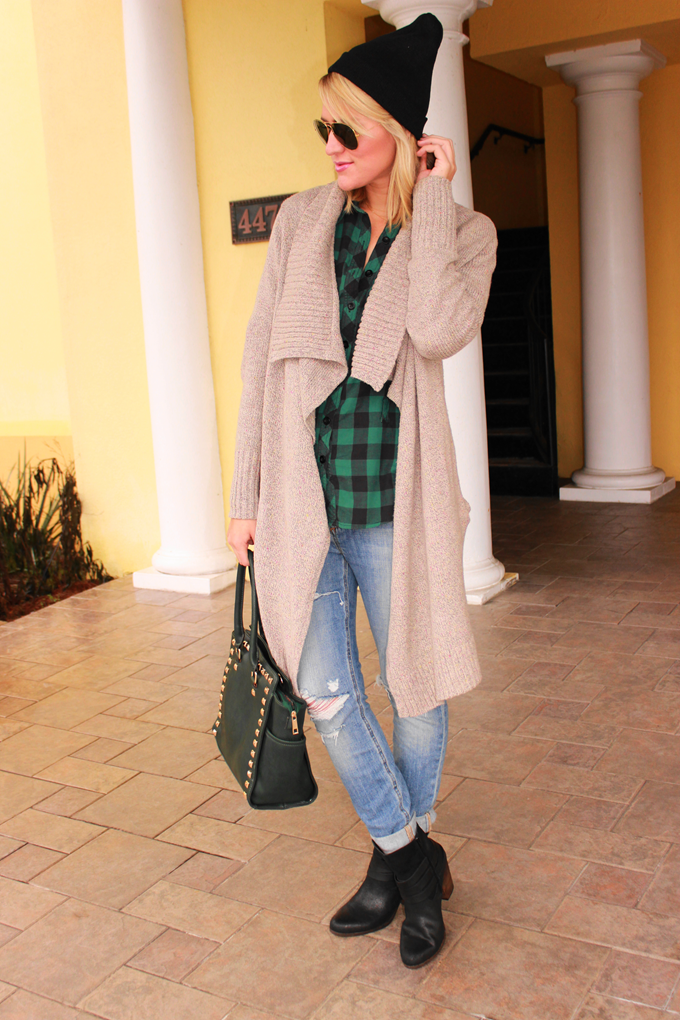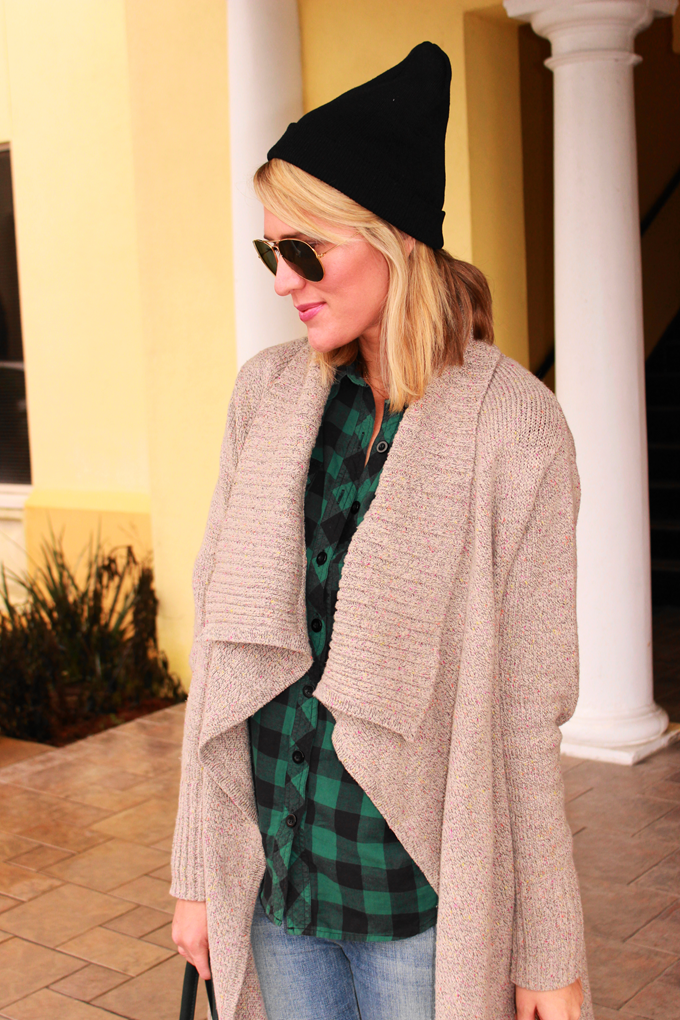 {sweater: CAbi Clothing c/o // shirt: Forever 21 (old, but similar style HERE) // denim: Joe's Jeans c/o Destination Maternity // boots: DSW c/o // beanie: Boohoo c/o // sunglasses: Ray-Ban // bag: LANY Handbags c/o // necklaces: Maya Brenner c/o (also available HERE & on sale HERE!) & Gorjana c/o}