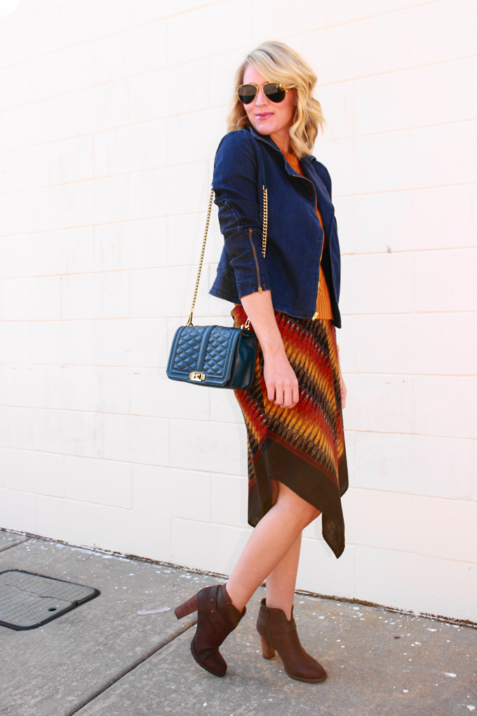 In the last post I featured a casual look, so this time around I wanted to dress things up a bit. I took advantage of the 60 degree weather we were having and reached for a vintage skirt without tights (yay!). I love the cut of this skirt (it’s so fun) and the colors remind me of a desert sunset. I paired it with a little cable-knit sweater and a great denim jacket.