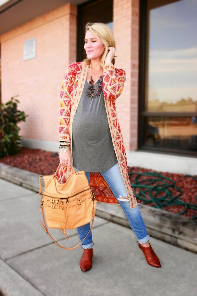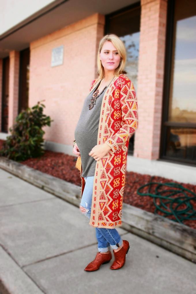 When the temps get low I crave an open cardigan sweater like nobodies business. It's effortless and undeniably cozy. What I love even more is when I find a cardigan sweater that's long in length (aka maxi). It's boho chic at it's best and pairs perfectly with denim, leggings, a wrap skirt -- you name it. When I stumbled upon a really good one, I'm talkin' one that's soft AND has an awesome print or color, then I find myself reaching for it almost every day (especially now that I'm about to pop (39 weeks 5 days to be exact)). This one from Boohoo has a super rad southwest print, and if you follow my blog then you know I'm a total sucker for anything southwest or tribal. The quality is SO good, y'all -- and for $20, it's just too good to pass up!