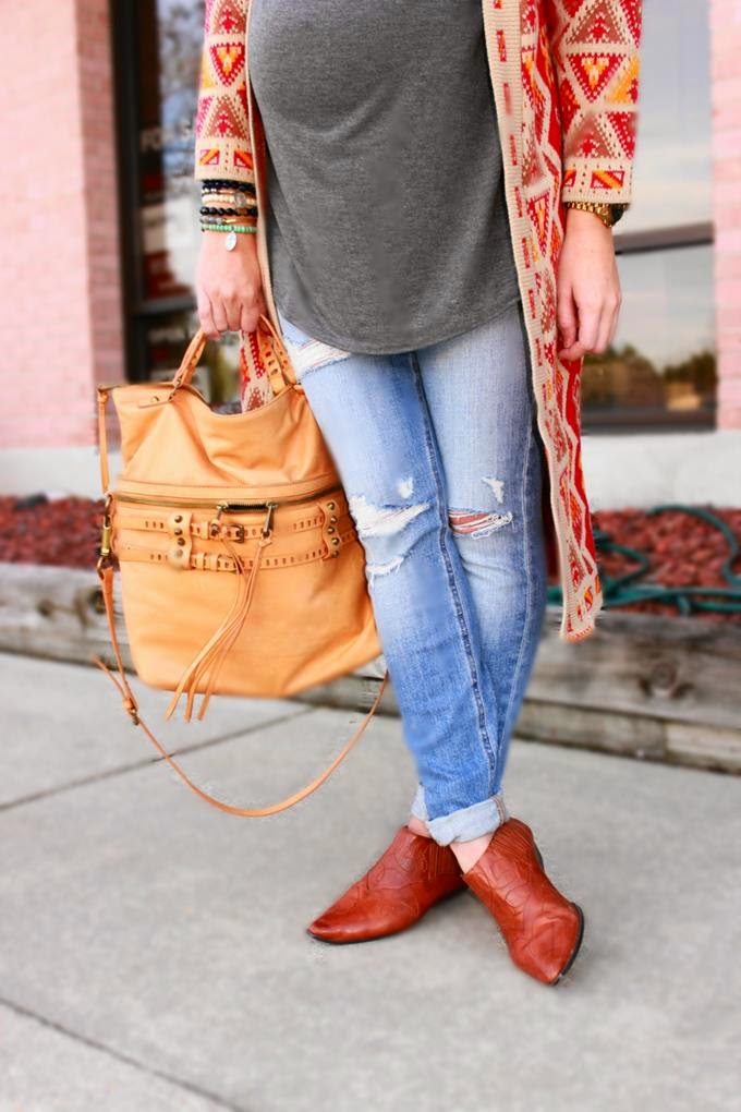 When the temps get low I crave an open cardigan sweater like nobodies business. It's effortless and undeniably cozy. What I love even more is when I find a cardigan sweater that's long in length (aka maxi). It's boho chic at it's best and pairs perfectly with denim, leggings, a wrap skirt -- you name it. When I stumbled upon a really good one, I'm talkin' one that's soft AND has an awesome print or color, then I find myself reaching for it almost every day (especially now that I'm about to pop (39 weeks 5 days to be exact)). This one from Boohoo has a super rad southwest print, and if you follow my blog then you know I'm a total sucker for anything southwest or tribal. The quality is SO good, y'all -- and for $20, it's just too good to pass up!