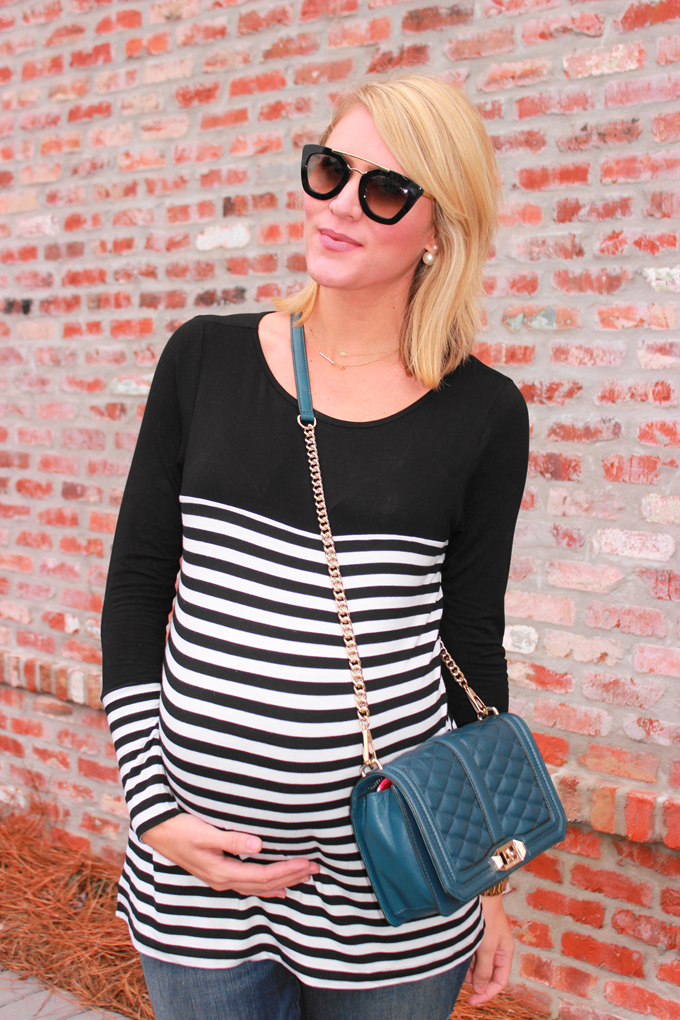 Oh, and I know y'all are probably sick and tired of seeing these New Balance sneakers (not to mention this bag too!), but I can't stop wearing them. My swollen feet can't really take any other shoe and these sneakers are too comfy and go with everything! It's a win/win. Lately, I'm all about leggings or a slouchy jean, paired w/ and easy top or sweater -- and this striped Olian top from Pickles & Ice Cream Maternity is where it's at. It will be perfect even post baby.