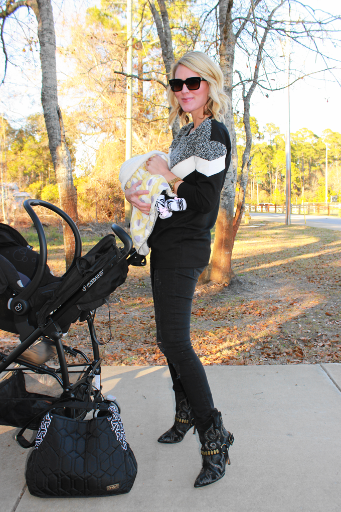 {stroller: Maxi-Cosi Kaia Mico NXT System c/o Maxi-Cosi // diaper bag: cinda b c/o // Bridgett's bodysuit: Target (old, but love these HERE, HERE, and HERE) // my denim: TEXTILE by Elizabeth & James c/o (old, but similar style HERE/HERE/HERE) // sweater: Chic Wish c/o (p.s. can also be worn as a dress w/ tights) // boots: Nine West (sold out, similar styles HERE/HERE/HERE) // sunglasses: Saint Laurent}