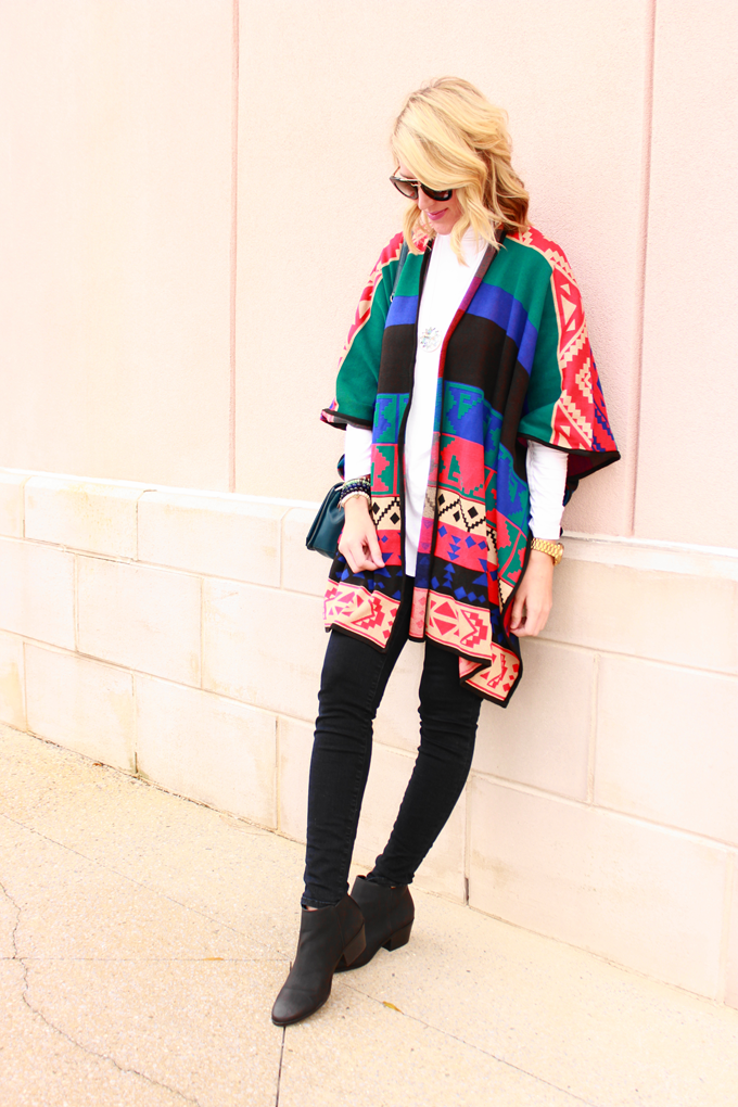 Isn't this poncho amazing, y'all?! If you've been following my blog for awhile then you probably are aware of my southwest obsession, so naturally this poncho was a must-have the instant I laid eyes on it! The bold colors and print, the easy style, AND the quality are all on point, and guess what? You can snag this beauty for under $60. Ponchos are a lot like kimonos in my book. They can be dressed up or down with ease. This poncho is particularly awesome because it has arm holes (not just a hole for your head), making it more functional than most ponchos.