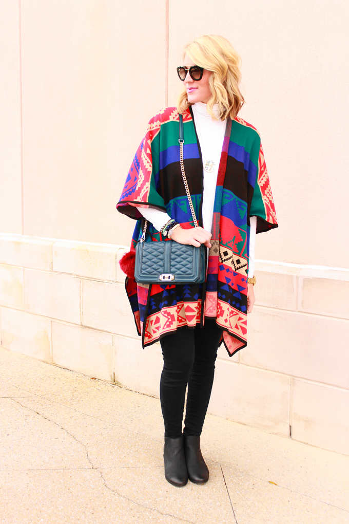 {turtleneck: Karen Kane c/o (also get HERE) // poncho: Chic Wish c/o // denim: J Brand c/o Destination Maternity // boots: Call It Spring c/o // bag: Rebecca Minkoff (also HERE) // necklace: HoH1960 c/o The Jeweler's Wife // keychain: EllandEmm c/o // sunglasses: Prada (sold out but similar style HERE) // bracelets: Blessings In Disguise}
