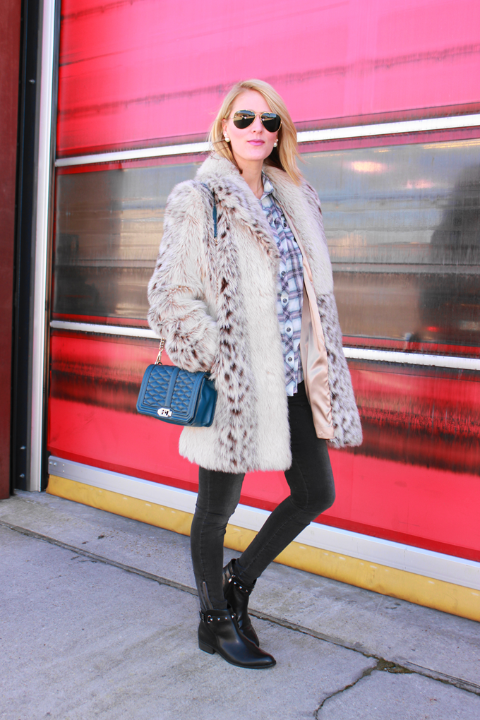 {faux fur coat: vintage (similar styles below) // denim: Anine Bing c/o (also available HERE) // shirt CAbi Clothing c/o // boots: Easy Spirit c/o *On MAJ sale and also come in suede olive green! // aviators: Ray-Ban // bag: Rebecca Minkoff // earrings: Amazon (also available HERE)}