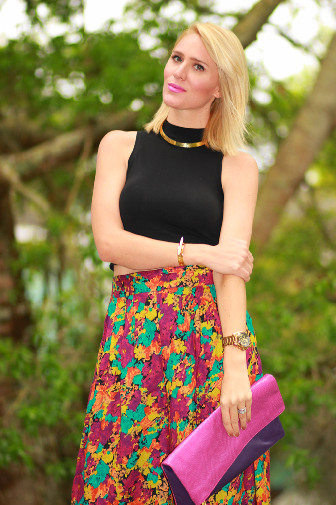 I finished off my look with some rad vintage accessories, like this amazing Elie Tahari clutch from Nikita and Vesper. I mean, isn't it just gorgeous? The pretty pops of purple are the perfect touch to any spring or summer look. Since my culottes and clutch were the main focus of my look, I kept my jewelry pretty simple with a vintage gold choker (minimal, but oh so chic) and one of my fave cuffs from Jurate Brown.