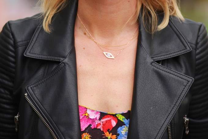 Since the weather was pretty crummy and because I love to mix styles, I topped the girly spring romper with an edgy faux leather moto jacket. This one by Project Gravitas is so good. Feels and looks like real leather, and I am in love with the ribbed sleeves.