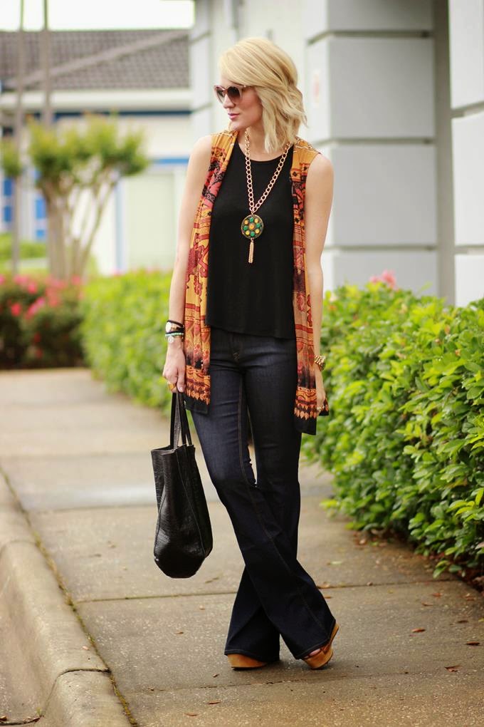 If you've been following for awhile than you know my love for denim. I've been reviewing denim on Denimology.com for four years now, and discovering new brands is one of my fave parts of the job. I recently received this pair of from a brand that is pretty new to scene: Schoen By Yu. The brand was created by renowned fit model, Lindsey Schoen, and veteran designer, Michelle Yu. This pair I'm wearing is their "Bombshell" and it's a high-waisted trouser flare. Flares and bell-bottoms will always be my favorite. It's their 70's boho chic feel that I cannot get enough of. I'll be writing a full review on these jeans for Denimology.com very soon, so stay tuned for that. To finish off the boho-chic vibe I was after, I paired these flares with my go-to fave tank (seriously, y'all need a pair or 2 or 3 or 4 -- the fit is perfect and the price cannot be beat!), one of my fave vintage tribal long vests, an eye-catching vintage statement necklace and a great pair of wooden wedges. It's 70's with a modern feel.