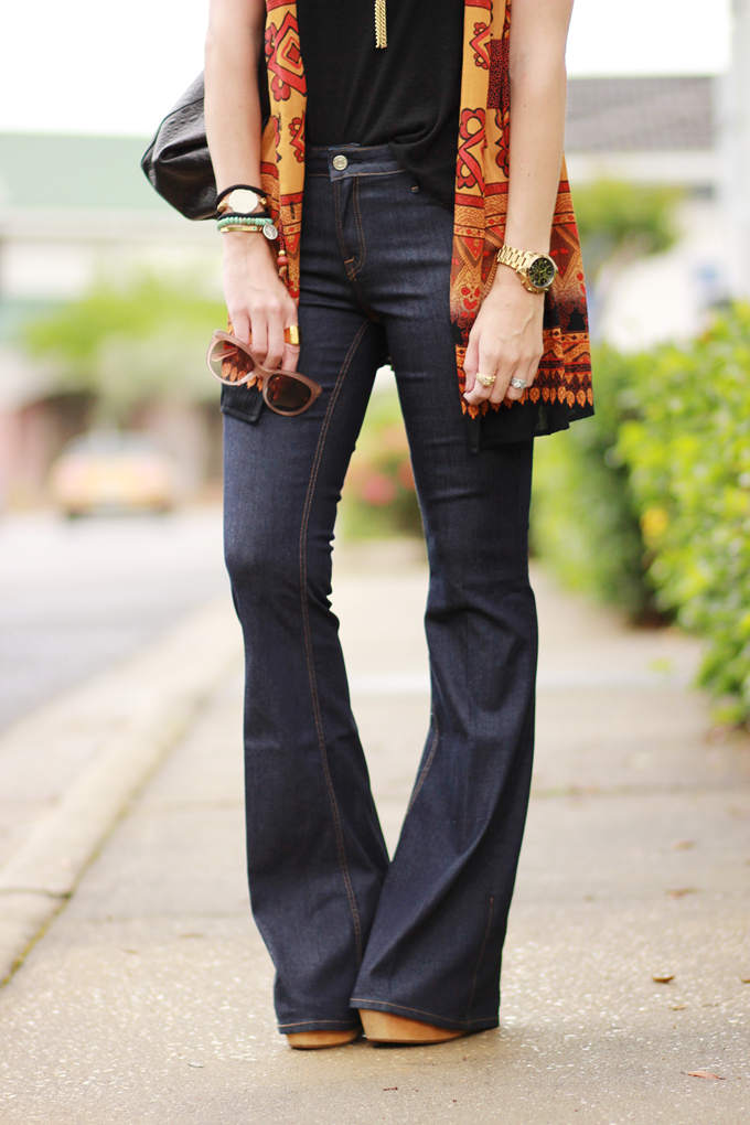If you've been following for awhile than you know my love for denim. I've been reviewing denim on Denimology.com for four years now, and discovering new brands is one of my fave parts of the job. I recently received this pair of from a brand that is pretty new to scene: Schoen By Yu. The brand was created by renowned fit model, Lindsey Schoen, and veteran designer, Michelle Yu. This pair I'm wearing is their "Bombshell" and it's a high-waisted trouser flare. Flares and bell-bottoms will always be my favorite. It's their 70's boho chic feel that I cannot get enough of. I'll be writing a full review on these jeans for Denimology.com very soon, so stay tuned for that. To finish off the boho-chic vibe I was after, I paired these flares with my go-to fave tank (seriously, y'all need a pair or 2 or 3 or 4 -- the fit is perfect and the price cannot be beat!), one of my fave vintage tribal long vests, an eye-catching vintage statement necklace and a great pair of wooden wedges. It's 70's with a modern feel.