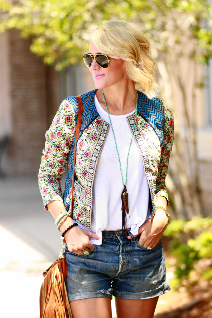 When I'm in a style rut and not sure what to wear, I always reach for a pair of denim, an easy tank, and a great blazer or jacket. It's effortless cool at it's best. It's amazing the difference a cool jacket can make. In both looks I'm wearing a simple white tank and a pair of shorts, but the jackets really make the outfits look pulled together and stylish. The first jacket has a great boho feel to it, with the patchwork print and cropped style. It reminds me so much of a lot of vintage jackets I find while thrifting. The second jacket is minimal chic and is so versatile. It's perfect for those looks where you want to wear a pair of sneakers to run errands or a pair of heels for a night out.