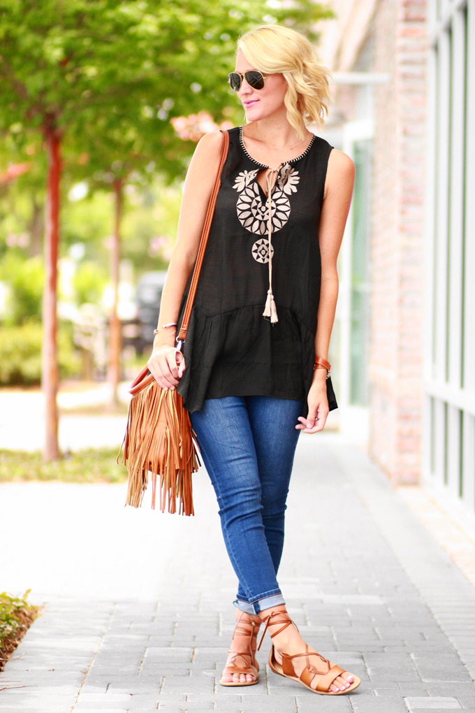 I love pairing black and tan together. I've never been one to follow the silly rule that says you can't wear black with brown -- anyone with me?! In fact, I've styled a couple other black and tan outfits on the blog before (check out these super old posts here and here). This outfit is definitely "ME" -- very boho, but casual and easy for running errands with the girls or grabbing lunch with the hubs. I love the flowy style of this top and the tassels are too cute! I know y'all are prob tired of seeing this fringe bag, but it's definitely my favorite as of late. I also cannot stop wearing these lace-up Old Navy sandals -- they're so light and comfy!