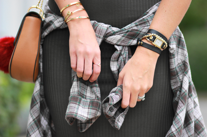 {dress: Forever 21 *Under $20! // flannel: Target (old and from the boys section, shop more below!) // sneakers: Adidas // bag: Forever 21 (sold out, similar here) // pom pom: EllandEmm c/o // sunnies: Saint Laurent // earrings: Bling Jewelry c/o *I can't stop wearing them! // cuffs: Lisa Stewart Jewelry c/o & EllandEmm c/o // watch: La Mer Collections c/o}