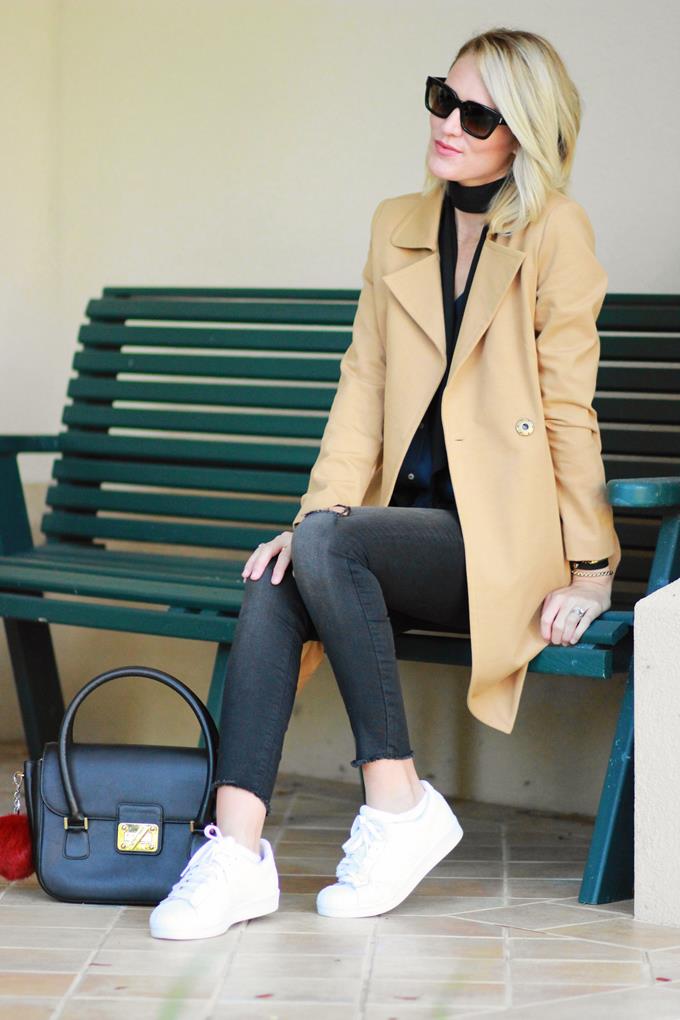 {trench: cabi c/o // denim: Old Navy c/o *Use code: GINORMOUS for 40% off! // top: H&M (similar and love this one) // sneakers: Adidas (also here) // bag: Merci-Fortune c/o // pom: EllandEmm c/o // sunnies: Saint Laurent // scarf: Express (shop more via the widget below!) // bracelets: Alex and Ani c/o // watch: La Mer Collections c/o *Use code: BELLEDE15 for 15% off your purchase!}