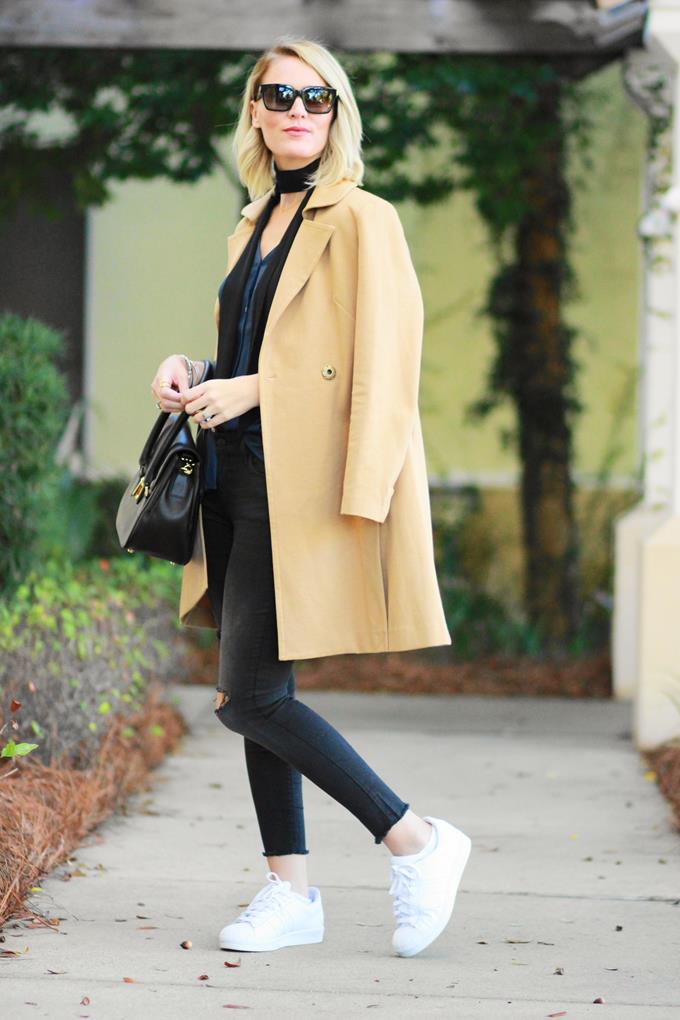 There's nothing more classic than a camel trench coat. It instantly pulls a look together and adds polish. It's super versatile as well. Wear it with jeans and a tee or a dressier ensemble. I paired mine with a look that's casual, but chic -- a silk blouse and some distressed denim. I finished off my look with my fave accessory as of late (aside from my Chanel brooch, of course): the black skinny scarf. Stay tuned for a post where I'll show you different ways to tie it.