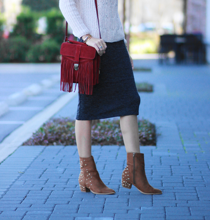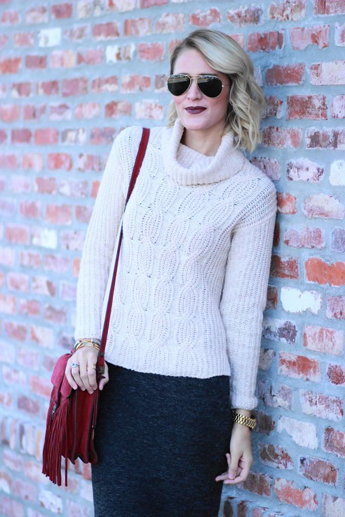 Winter calls for cozy layers and one of my favorite ways to layer is with a dress and sweater. This sweater dress from Old Navy is the perfect layering piece because it's a thin knit, so it doesn't create a lot of bulk, yet it still keeps me cozy and warm. The midi-length is perfect for colder weather too! I wore this chunkier turtleneck, also from Old Navy, on top for some added warmth. It's in a pretty blush tone and looks great paired with the charcoal color of this dress. I love how this neutral outfit looks like a midi skirt and sweater, but it's actually a dress underneath. If I get too warm I can tie the sweater around my waist -- and since this FL weather keeps playing tricks on us, a girl has to have options! ;)
