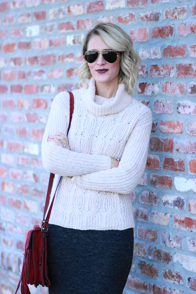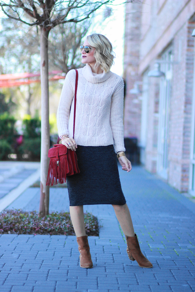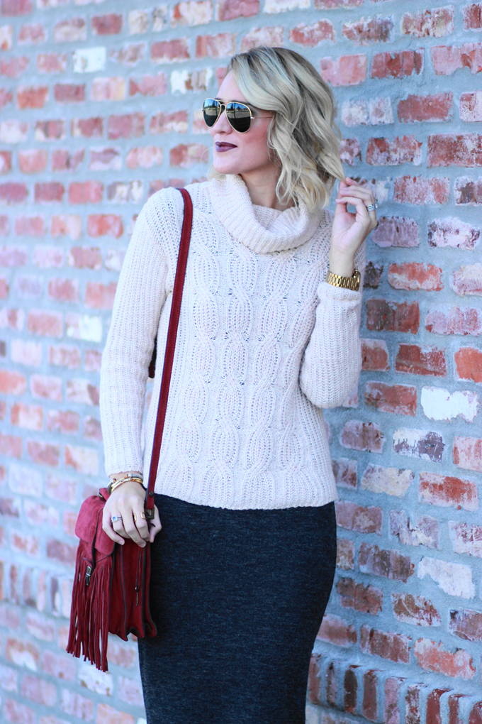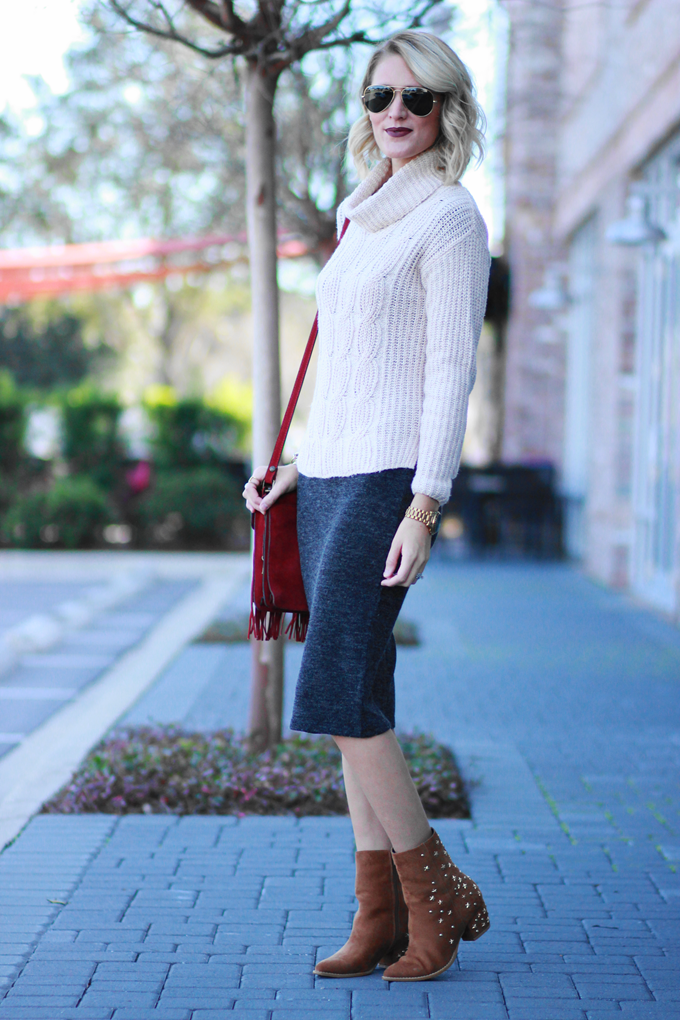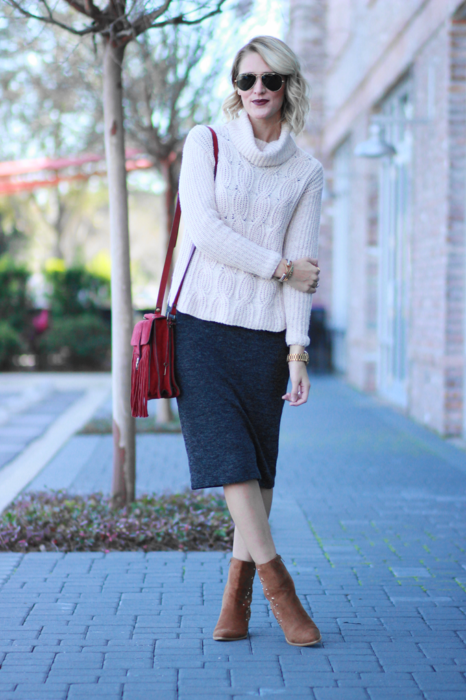Winter calls for cozy layers and one of my favorite ways to layer is with a dress and sweater. This sweater dress from Old Navy is the perfect layering piece because it's a thin knit, so it doesn't create a lot of bulk, yet it still keeps me cozy and warm. The midi-length is perfect for colder weather too! I wore this chunkier turtleneck, also from Old Navy, on top for some added warmth. It's in a pretty blush tone and looks great paired with the charcoal color of this dress. I love how this neutral outfit looks like a midi skirt and sweater, but it's actually a dress underneath. If I get too warm I can tie the sweater around my waist -- and since this FL weather keeps playing tricks on us, a girl has to have options! ;)
