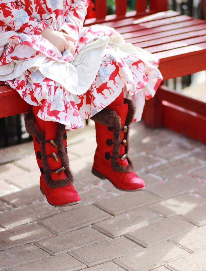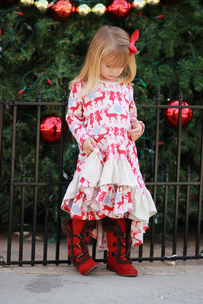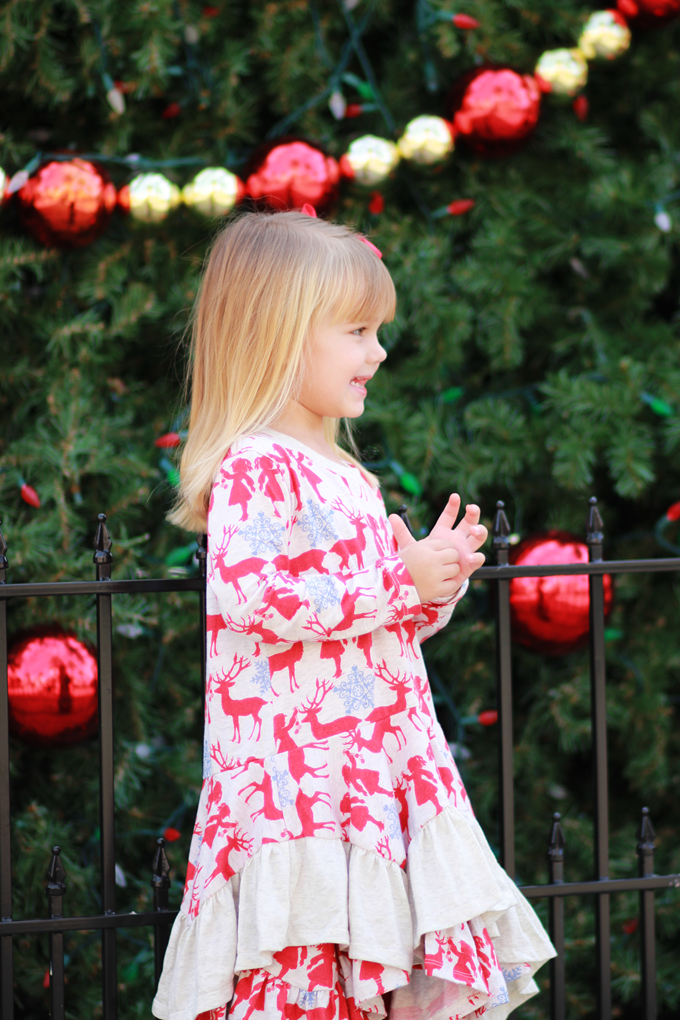 Court's Festive Reindeer Ruffled Dress is from Little Skye's Paper Wings Collection. The collection has a whimsical, retro feel to it and the prints and styles are so cute that I just wish they had adult sizes for myself. ;) The Paper Wings clothing Collection features other Holiday dresses for girls, but they also have other unique styles featuring prints with more of a boho-feel, like arrows, tepees and feathers. Y'all know me and my obsession with anything boho, vintage or retro, so The Little Skye Kid's Boutique was an instant fave for me. I really fell in love with the Reindeer print of Court's dress, but the ruffles sealed the deal. Seeing her twirl around and hold up the side of her dress just made me melt.