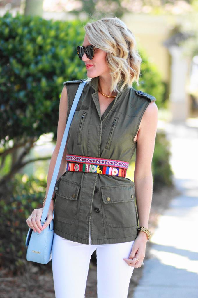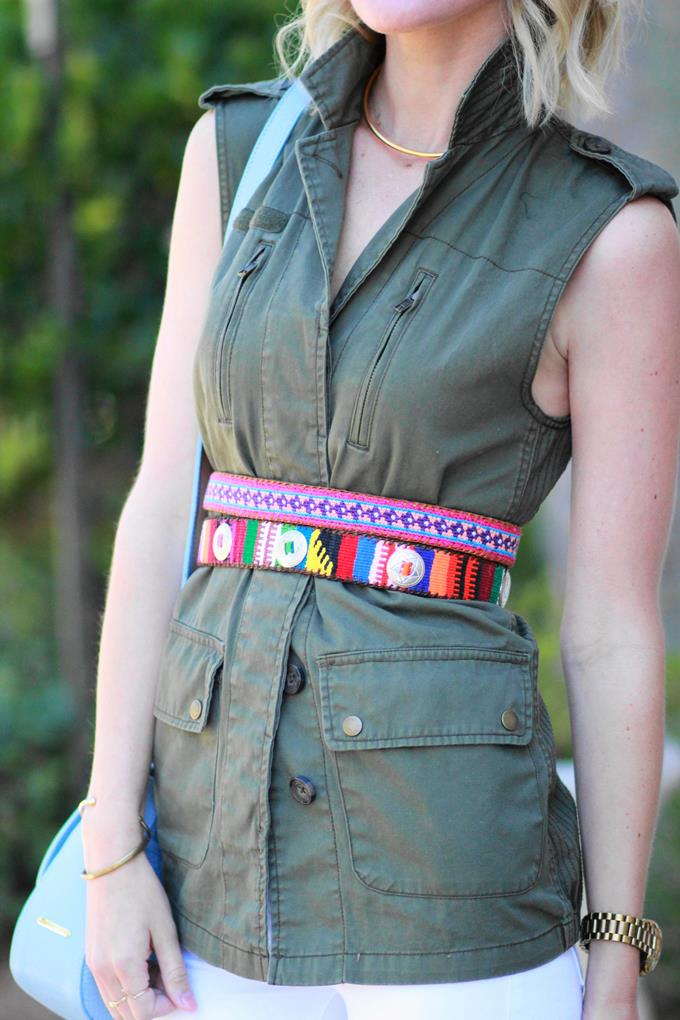 I love how accessories can easily transform a look -- especially a great bag or belt. An interesting belt or a handbag with great details can elevate even the simplest of looks. For this casual-chic outfit I went with one of my favorite utility vests, but decided to wear it as a top. I love the look of a belted blazer or vest (if you haven't tried it yet, you really should). I think it gives off such an effortless-chic vibe and I love how it cinches my waist.