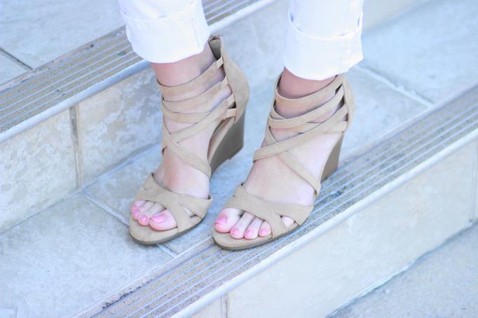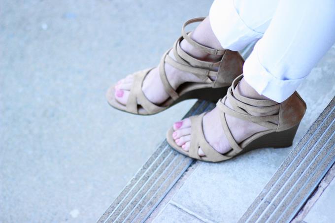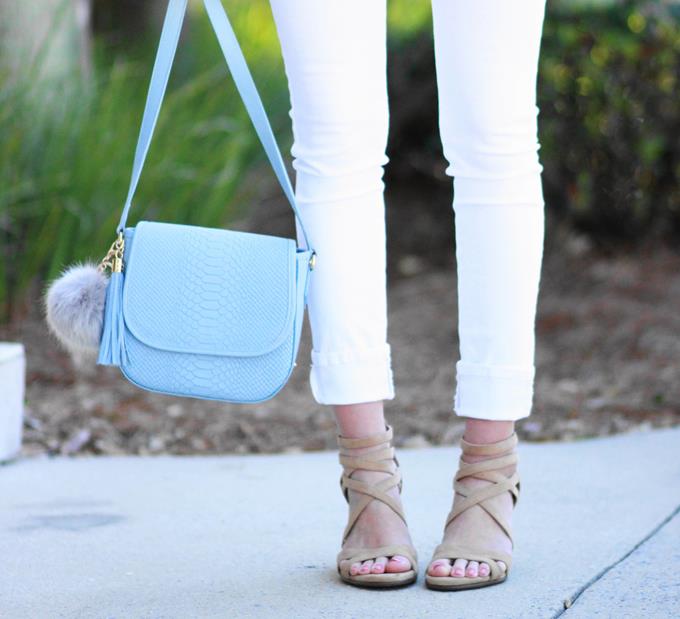 I always love to incorporate some color into my looks, so these vintage tribal belts really helped to liven up my neutral pieces. My new saddle bag from GiGi New York also served as the perfect pop of color. This pretty blue hue is called "Hydrangea", which could not be more fitting. I think it's so fresh for spring! I finished my look with these new strappy wedges from Aerosoles. They're the perfect sandal to dress up or down and they are beyond comfortable, y'all. They seriously feel like your walking on pillows. I could wear them all day.