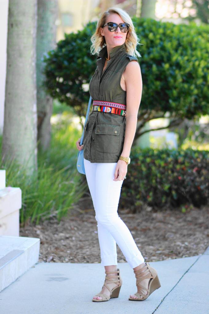 Love the army green and white with the bright colors! Those belts are super cute and totally remind me of your blog theme! :)