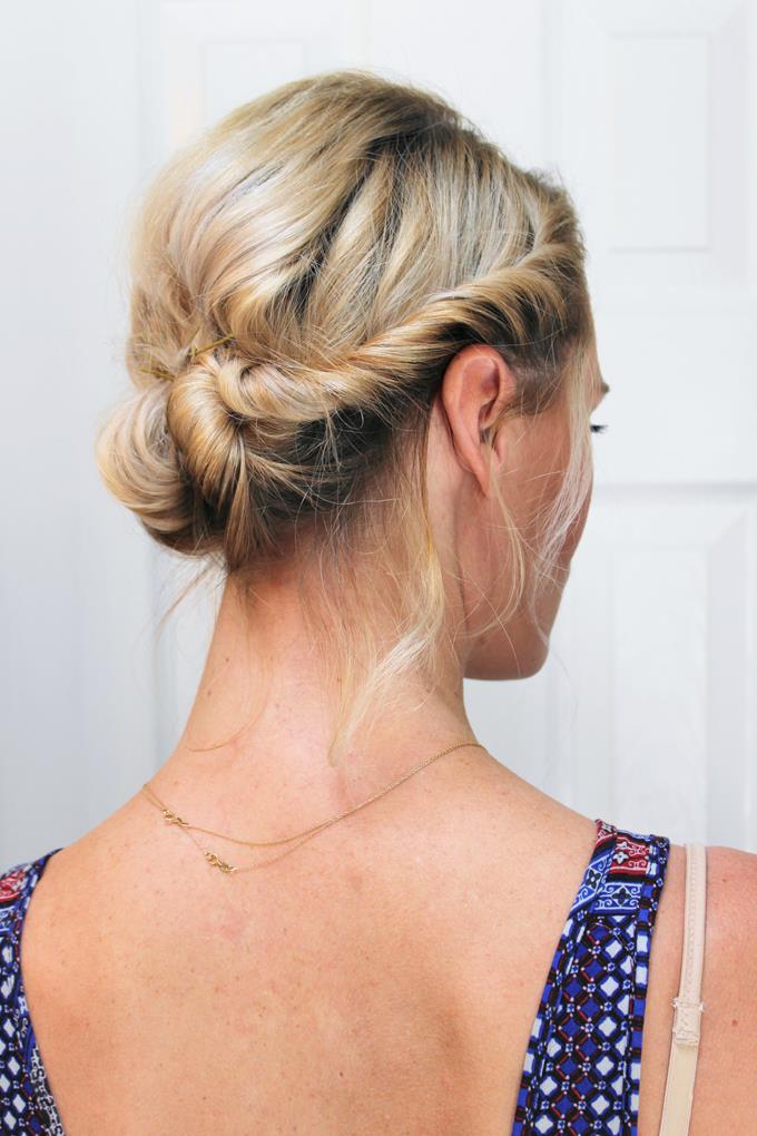 For this look, you start by twisting a small portion of the hair on the other side of your head (opposite side of the braid). Pull hair into the twist as you’re twisting (just like you do with a braid). Once you reach the back of your head, bobby pin the twist so it stays in place. Then gather the hair on the braided side. Twist and bobby pin in the back of your head. You can twist into a bun or just twist and turn the hair upwards then pin. My hair isn’t very long in the back, so I couldn’t really achieve a twisted bun look, but as I said above, this look is supposed to look effortless so it’s OK if there are some flaws. After the braided side is pinned, do the same with the twisted side. Gather all the hair, twist and pin in the back of your head.