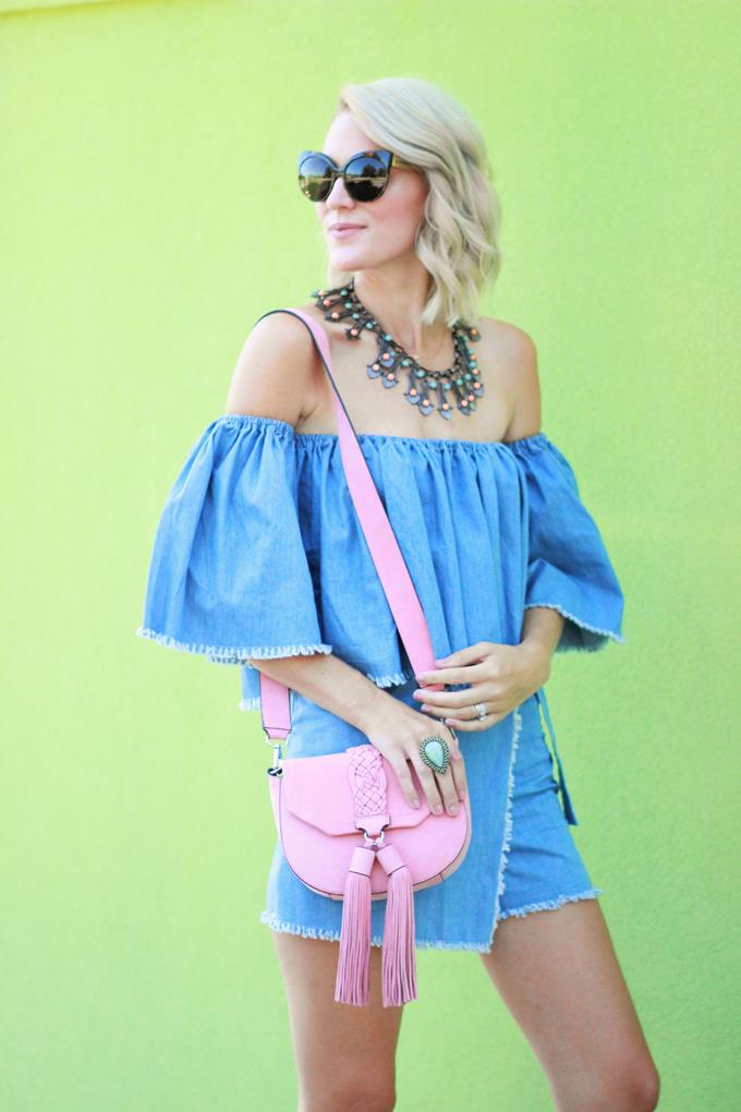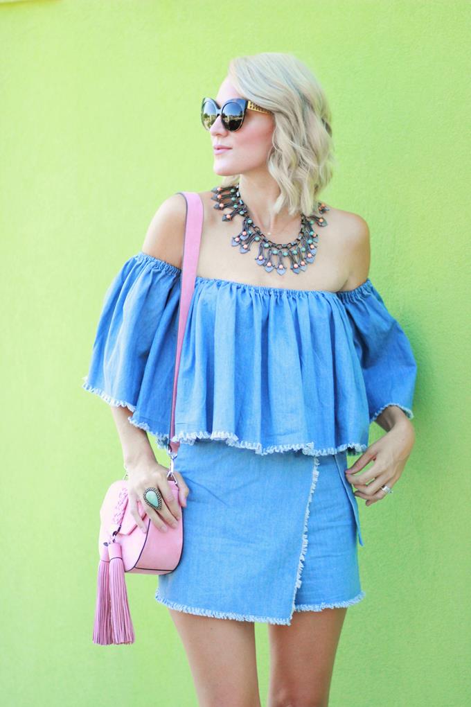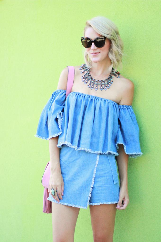 I'm all about a denim on denim look, but it's not as easy to achieve in warmer months. When I saw this denim two-piece set from Chic Wish I was instantly smitten and knew it would be the perfect look for achieving that denim on denim look during the summer. For one, the top is off-the-shoulder (which is another fave of mine and is a summer essential) and the bottoms are a skort (which is a lot comfier/easier than a skirt). Two-piece sets are great because you can wear each piece separately (which means more bang for your buck). This top is perfect all summer long! Pair it with white denim or a pair of flowy printed pants. The skort is perfect for dressing up or down and can be paired with a variety of tops.