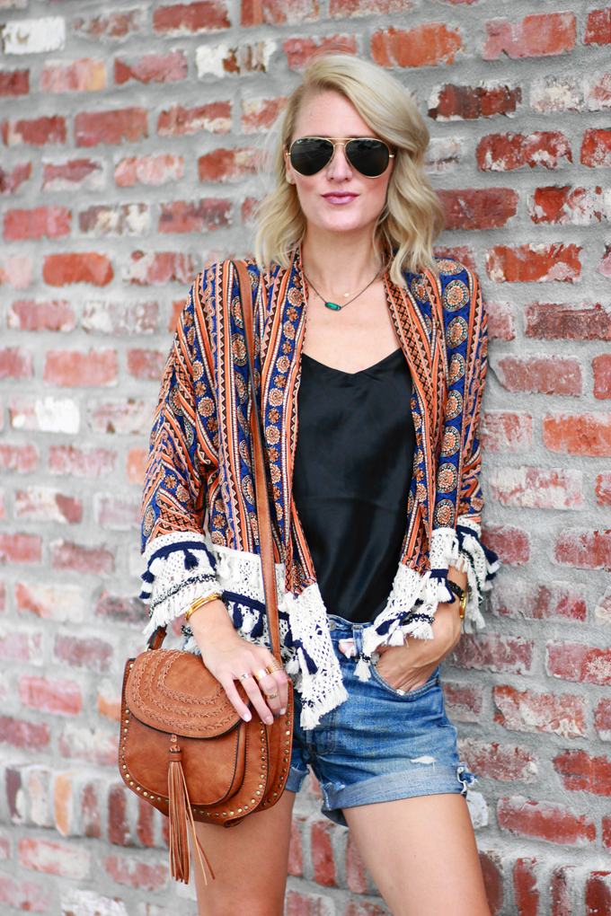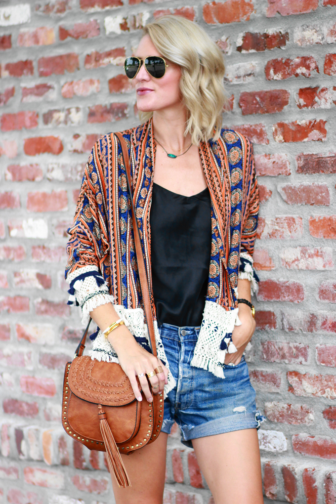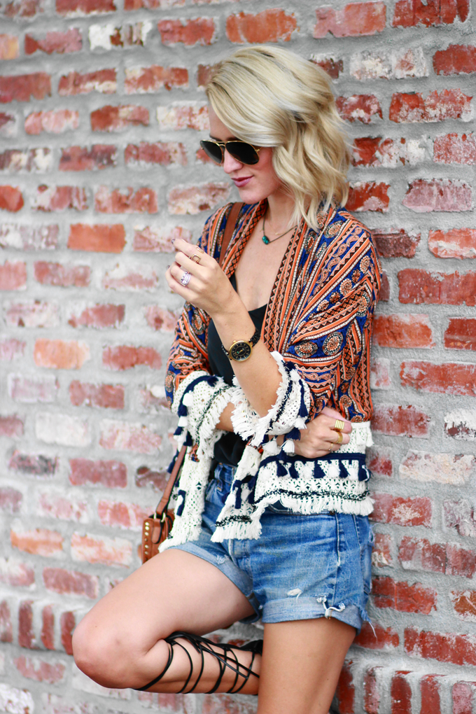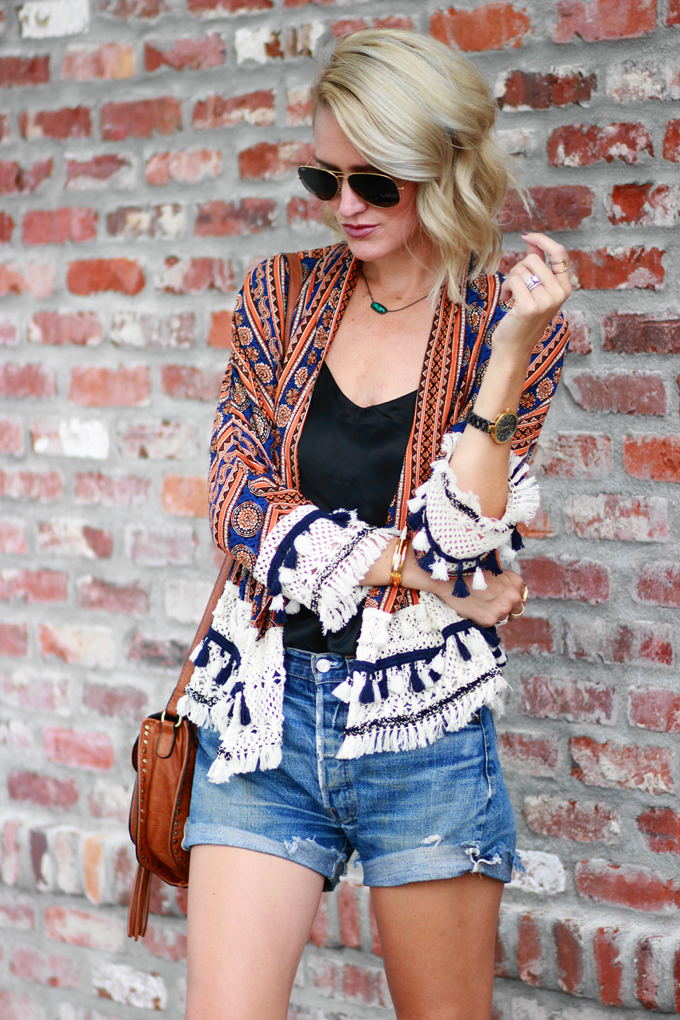 This jacket combines a few of my fave things -- tribal print, tassels, and effortless bohemian style. I wore this beauty yesterday and I honestly thought I would be sweating up a storm in the 90 degree heat, but I was actually quite comfortable. This jacket is perfect for summer because it has super light fabric that's easy and breezy. Plus it can also transition into the evening with some nice denim or trousers, and a dressier shoe. It's the perfect piece to take with you on your next summer getaway -- just think: versatile options = less packing! ;)