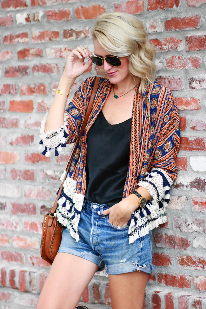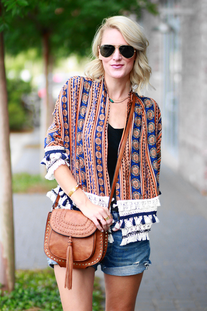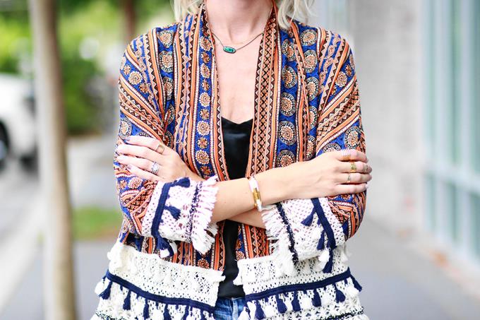 This jacket combines a few of my fave things -- tribal print, tassels, and effortless bohemian style. I wore this beauty yesterday and I honestly thought I would be sweating up a storm in the 90 degree heat, but I was actually quite comfortable. This jacket is perfect for summer because it has super light fabric that's easy and breezy. Plus it can also transition into the evening with some nice denim or trousers, and a dressier shoe. It's the perfect piece to take with you on your next summer getaway -- just think: versatile options = less packing! ;)