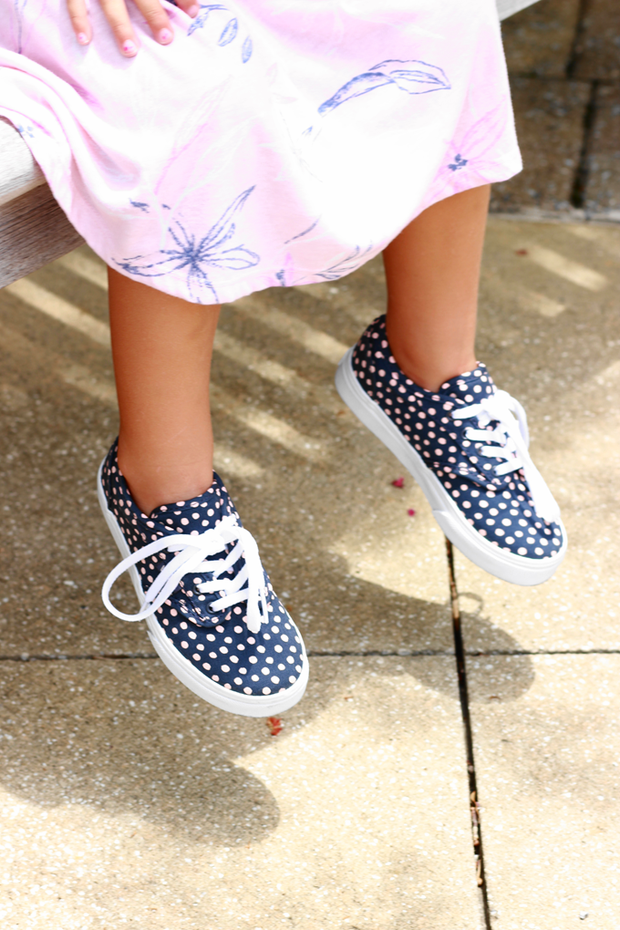 We recently visited our local Shoe Carnival for some back-to-school shoes for Courtney. She loves picking out what to wear each morning before school, so this was a shopping trip she was excited about. She’s just like her mama, in that, her favorite part of her outfit are her shoes, so she had a grand ‘ol time trying on a variety of styles from brands like Nike, Adidas, and New Balance. We settled on a pair of cute polka-dotted sneakers by Vans: the Atwood Low G in Blue/Pink Dots. They were so cute that we had to get my youngest daughter, Bridgett, a pair – the Vans Atwood V Girls in Blue/English. P.S. I love when my girl’s match and it’s something I try to do as much as possible because I know sooner than later they are NOT going to want to wear similar clothing or shoes. ;)