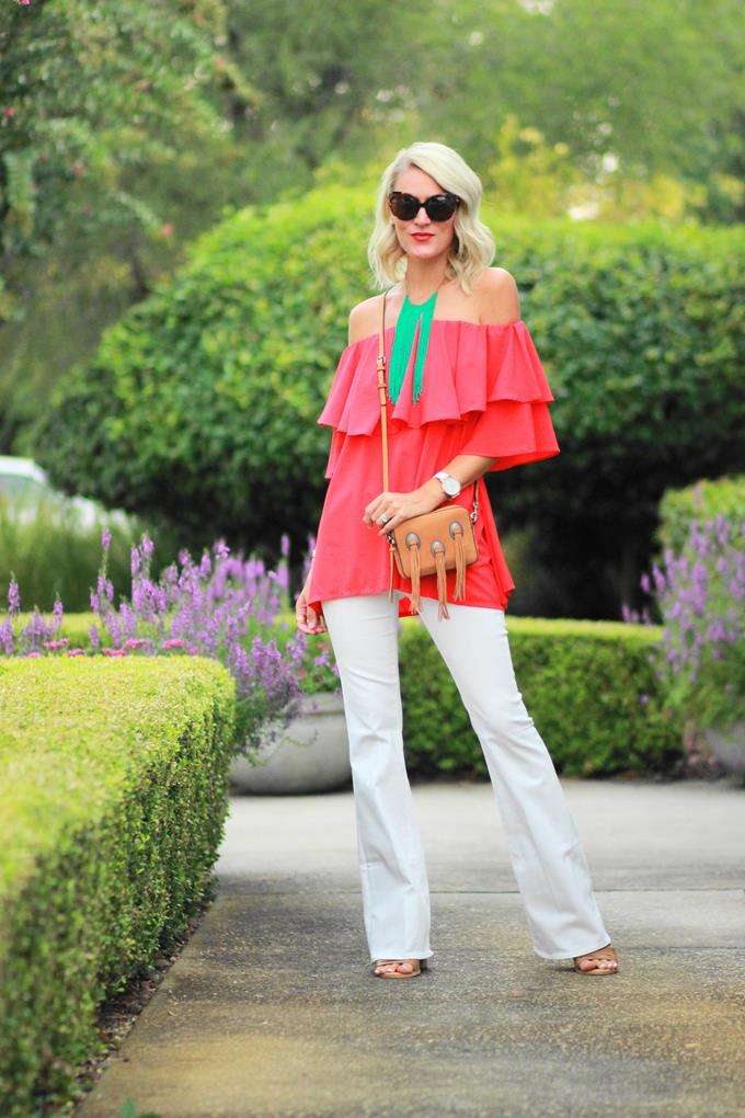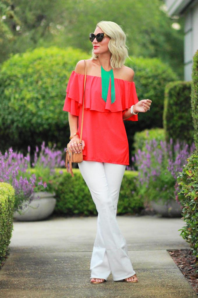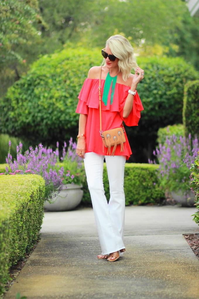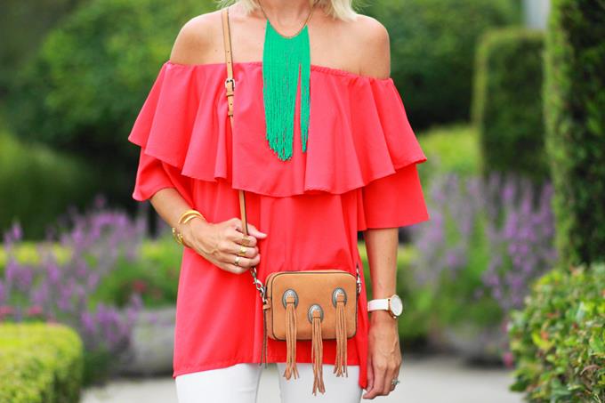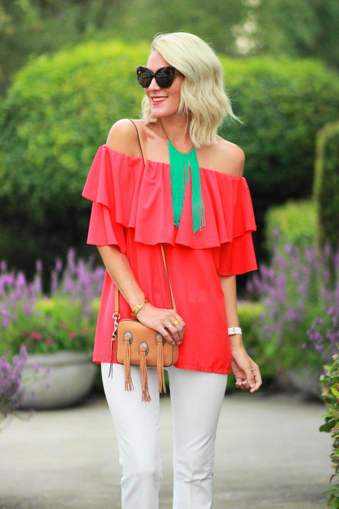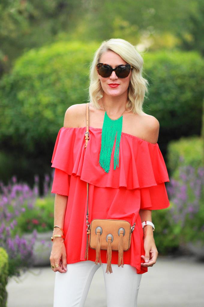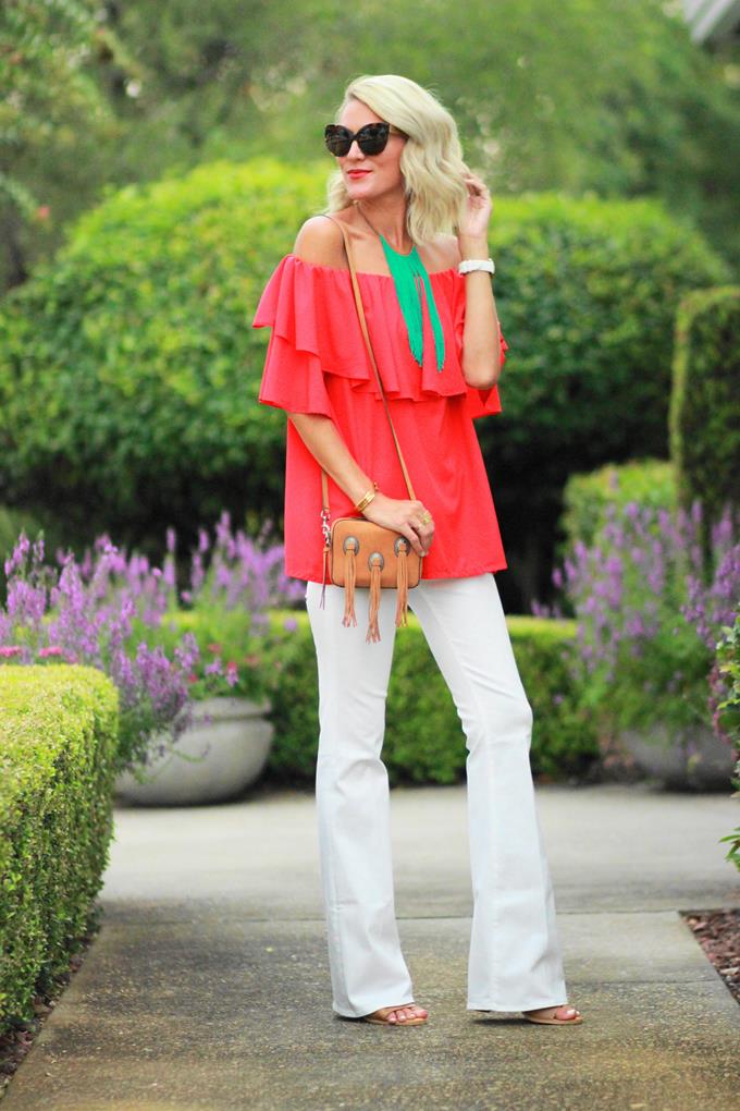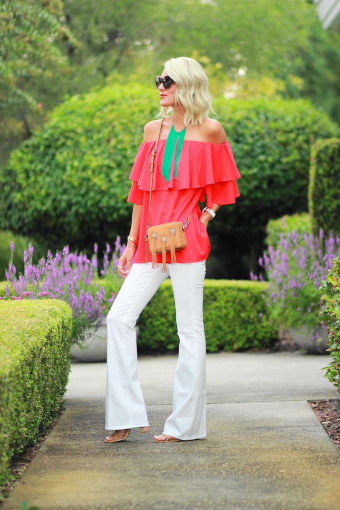 Some of of my favorite things all in one look: an off-the-shoulder top, white denim (+ flares to boot!), FRINGEEEEE, and western details (seriously cannot get enough of this cross-body). See any of your faves?