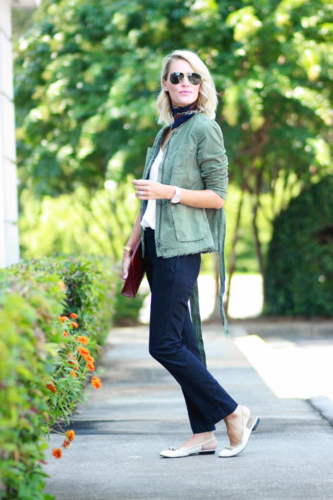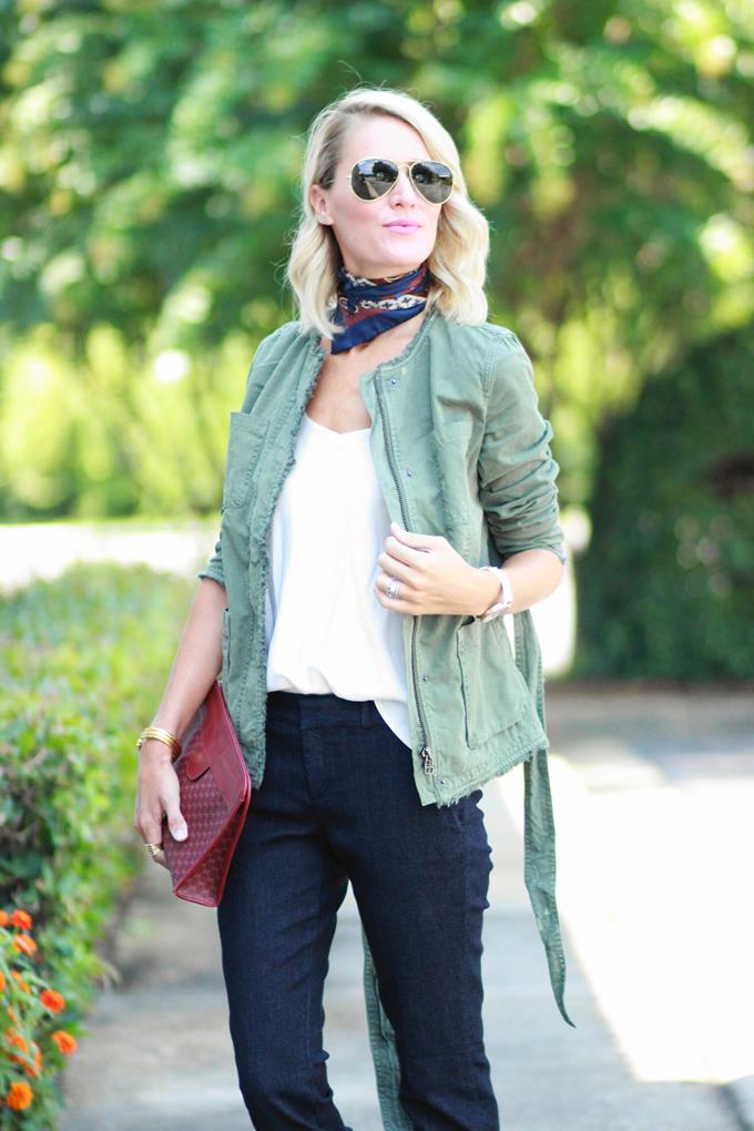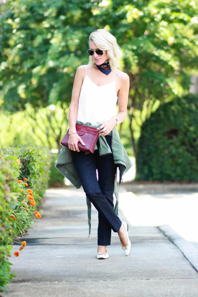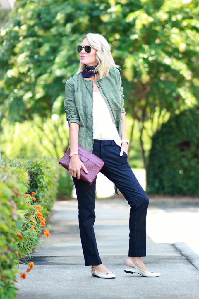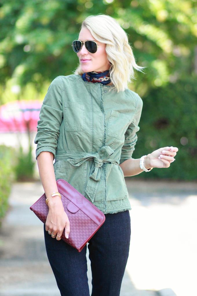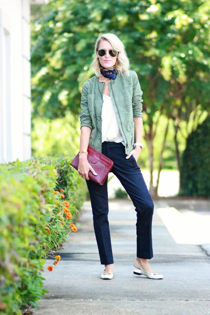 Happy Monday, loves! Sharing some new faves from Banana Republic today. Two pieces that are highly versatile and perfect for transitioning into fall (and winter). These pants are great for a casual office setting or for casual Friday. They are denim, but the darker wash and the tailored fit makes them look more like pants than jeans. This military jacket was an instant fave for me. I own quite a few military jackets, but this one is unique because it's collar-less and has a tie at the waist. It can be worn open, tied at the waist, or tied around your waist. It's great dressed up or down and is equally cute over a pretty dress. It's also perfect for layering into the cooler months. I finished my look with some vintage tried-and-true classics -- my vintage scarf (from my Grandpa), a vintage Gucci clutch, and my vintage Salvatore Ferragamo sling-backs. Sling-backs are totally having a moment right now and I am not mad about it. It has a "granny chic" vibe that is on point when styled just right.