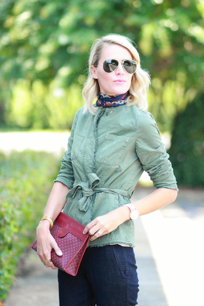 Happy Monday, loves! Sharing some new faves from Banana Republic today. Two pieces that are highly versatile and perfect for transitioning into fall (and winter). These pants are great for a casual office setting or for casual Friday. They are denim, but the darker wash and the tailored fit makes them look more like pants than jeans. This military jacket was an instant fave for me. I own quite a few military jackets, but this one is unique because it's collar-less and has a tie at the waist. It can be worn open, tied at the waist, or tied around your waist. It's great dressed up or down and is equally cute over a pretty dress. It's also perfect for layering into the cooler months. I finished my look with some vintage tried-and-true classics -- my vintage scarf (from my Grandpa), a vintage Gucci clutch, and my vintage Salvatore Ferragamo sling-backs. Sling-backs are totally having a moment right now and I am not mad about it. It has a "granny chic" vibe that is on point when styled just right.