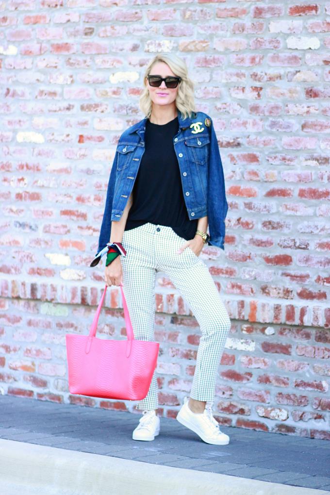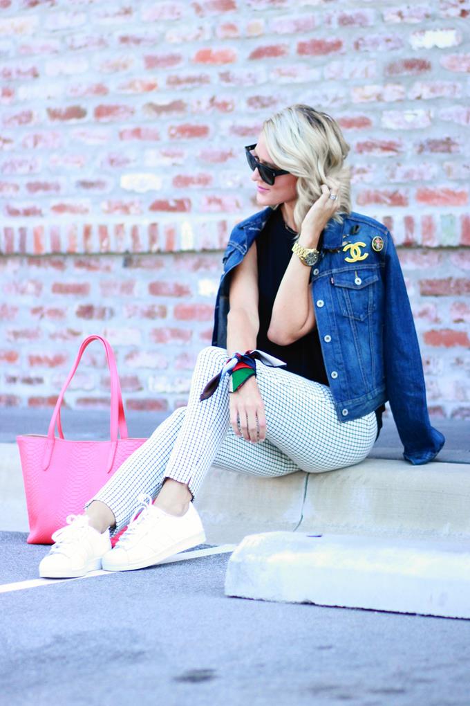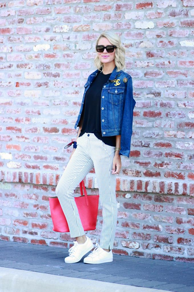 One of the biggest print trends this year is the windowpane print, so when I saw this pant from cabi's new fall collection I knew I had to have it. I'm always a sucker for prints, but very rarely are they as versatile as this print. Since the majority of windowpane prints are black and white, you can treat them as neutrals and pair them with just about anything in your closet -- even another print! These cabi Windowpane Trousers transition perfectly from summer to fall, and can be dressed up or down with ease. Here I went with a casual vibe that's ideal for the weekend. I live in Florida, and our fall temps are pretty mild, so I chose to pair my trousers with a denim jacket that can be worn on my shoulders or tied at my waist. I love adorning my jackets with vintage pins. I think it instantly elevates your look. ;) For my top, I went with one of my faves from the cabi spring collection: the muscle tee. Since it's a weekend look, I chose some comfortable and stylish white trainers. I finished my look with some edgy sunnies, a functional tote in a bold hue, and a vintage scarf tied at my wrist.
