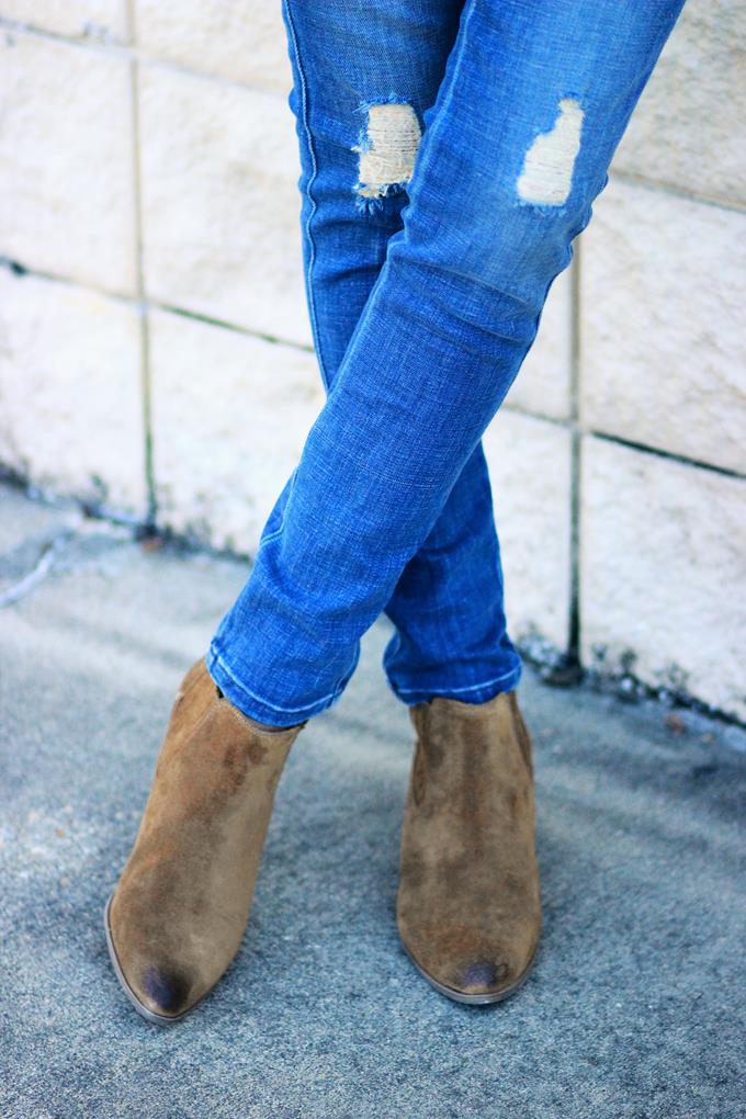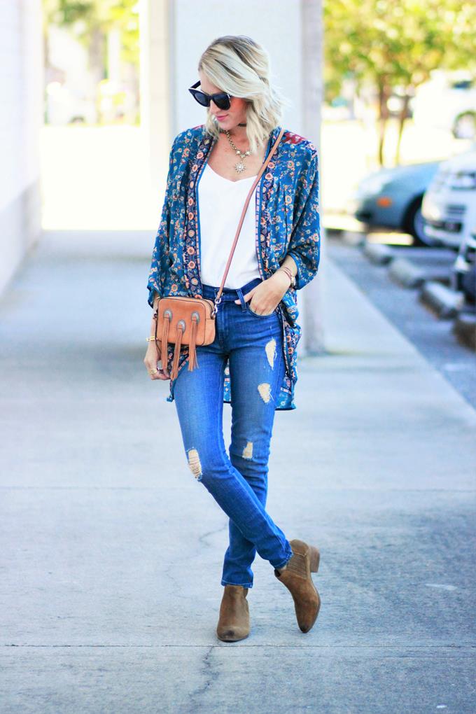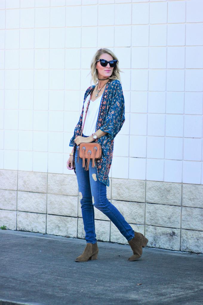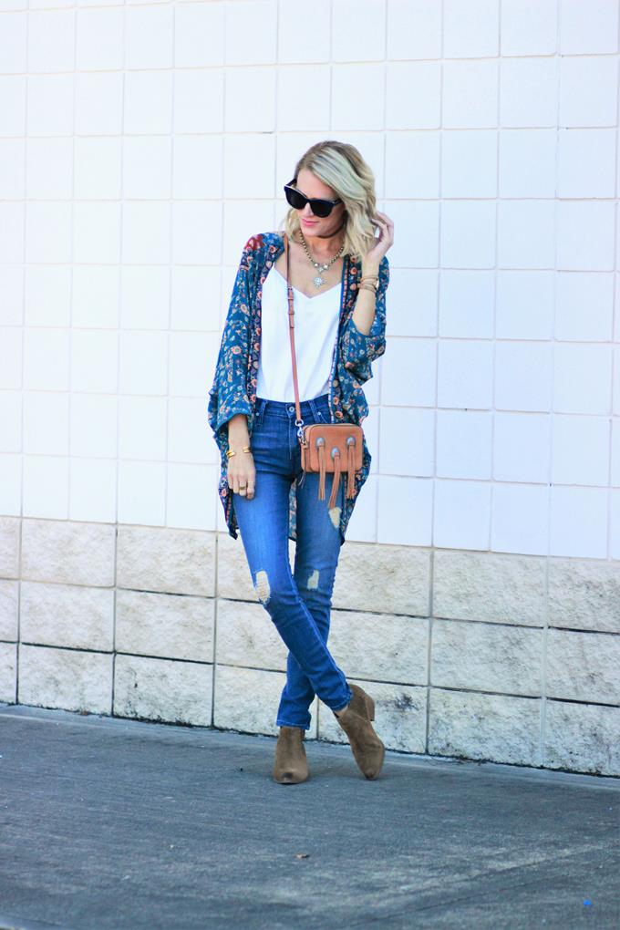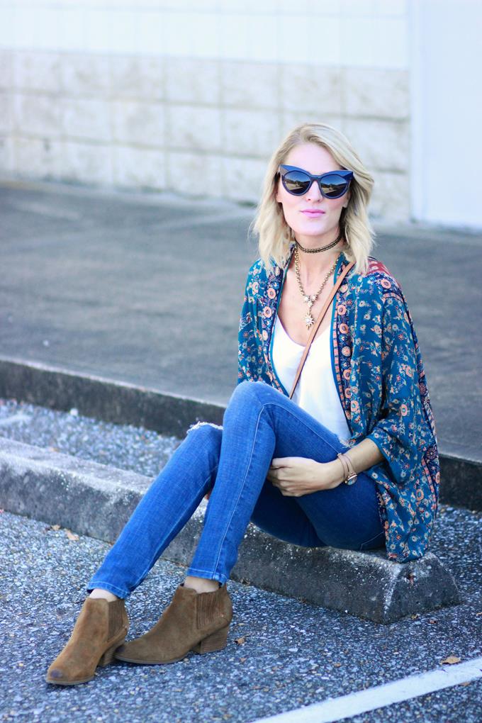 If I have to pick one western-inspired style that I love and that I rock the most it's most definitely a good western-style ankle boot. It has to be suede and the shape has to look just like a classic cowboy boot style, but it has to hit at the ankle. When I saw these Crown Vintage Lachlan Chelsea Boots via DSW it was love at first sight. They are perfection when it comes to achieving the western-style vibe without looking like an actual cowboy -- and that's my number one tip for rockin' the western trend, y'all. You want the vibe to be effortless and not over-the-top or else it will look like a costume. The key is to pick 1-2 western-style pieces and to pair them with other non-western style items from your closet (think classic or minimal pieces). I based my look off of these western ankle boots and this fringe crossbody bag. They both have western flare, but aren't in your face. To balance the look I paired them with denim (such a classic and the perfect pairing for just about any on-trend look), a silk camisole (another closet staple) and a printed kimono. The cat-eye sunnies and gold accessories elevated my overall casual look. My outfit is the perfect mix of boho chic with a touch of western -- my favorite combo to wear! ;)