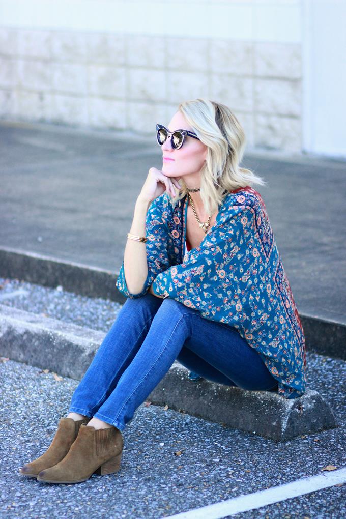 If I have to pick one western-inspired style that I love and that I rock the most it's most definitely a good western-style ankle boot. It has to be suede and the shape has to look just like a classic cowboy boot style, but it has to hit at the ankle. When I saw these Crown Vintage Lachlan Chelsea Boots via DSW it was love at first sight. They are perfection when it comes to achieving the western-style vibe without looking like an actual cowboy -- and that's my number one tip for rockin' the western trend, y'all. You want the vibe to be effortless and not over-the-top or else it will look like a costume. The key is to pick 1-2 western-style pieces and to pair them with other non-western style items from your closet (think classic or minimal pieces). I based my look off of these western ankle boots and this fringe crossbody bag. They both have western flare, but aren't in your face. To balance the look I paired them with denim (such a classic and the perfect pairing for just about any on-trend look), a silk camisole (another closet staple) and a printed kimono. The cat-eye sunnies and gold accessories elevated my overall casual look. My outfit is the perfect mix of boho chic with a touch of western -- my favorite combo to wear! ;)